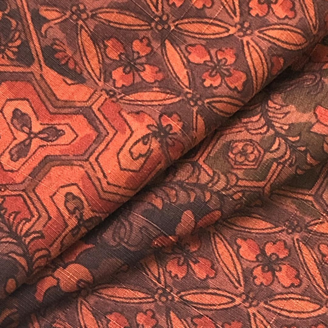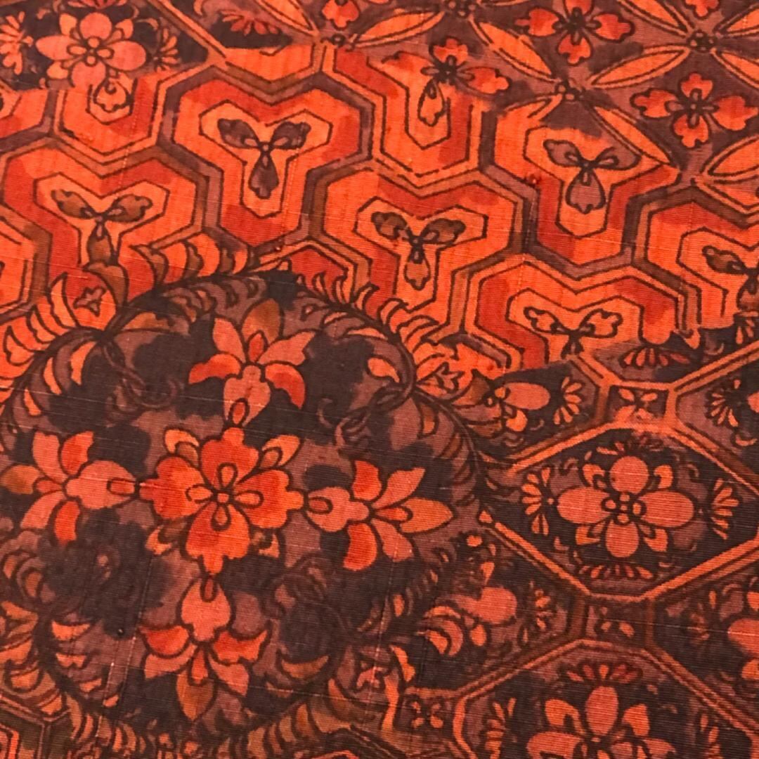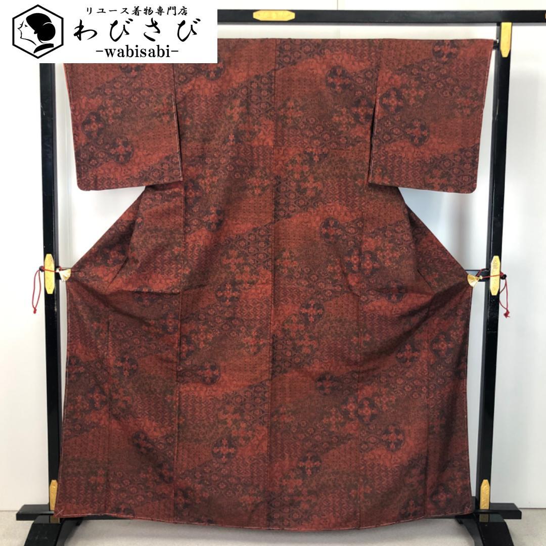 赤銅色ベースのお色味に花亀甲、花七宝などの花模様の柄裄がデザインされた雰囲気の良い素敵なお品でございます。