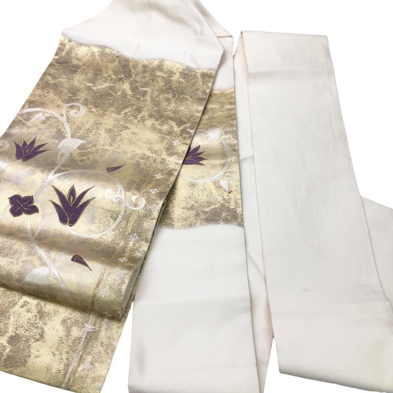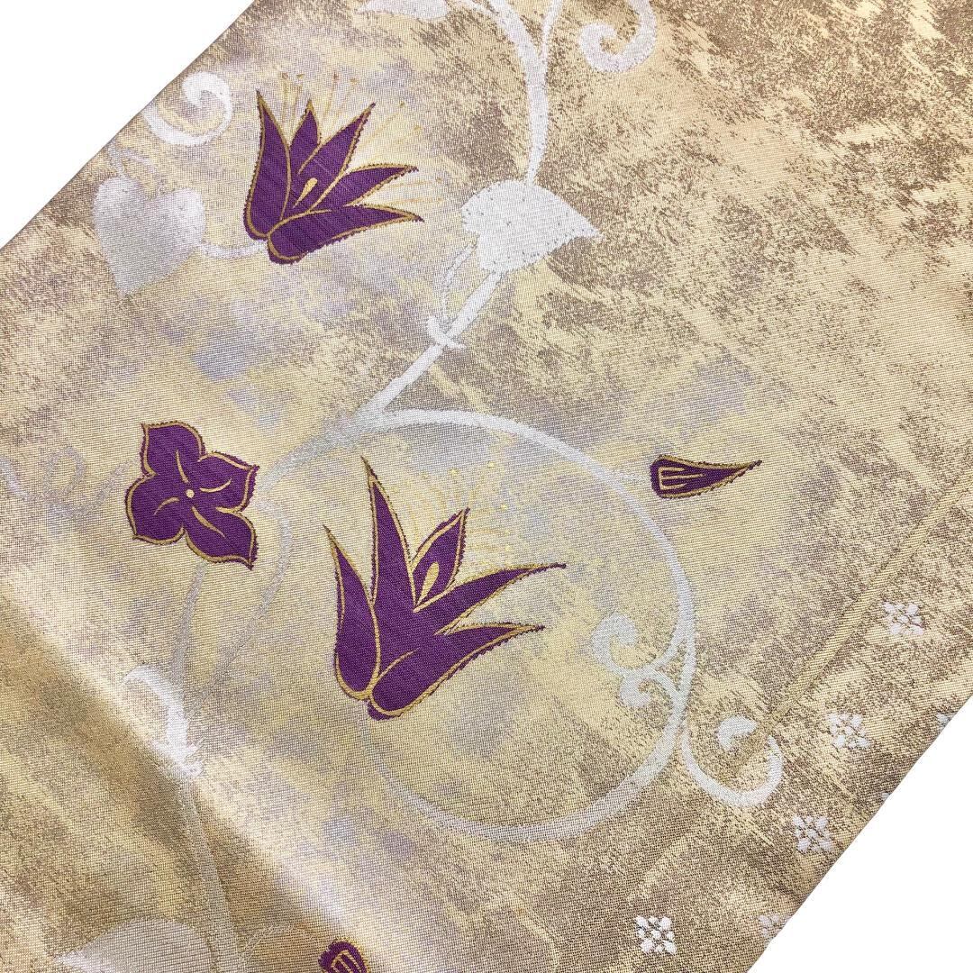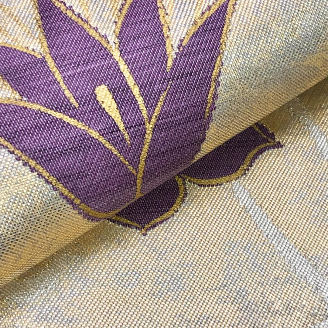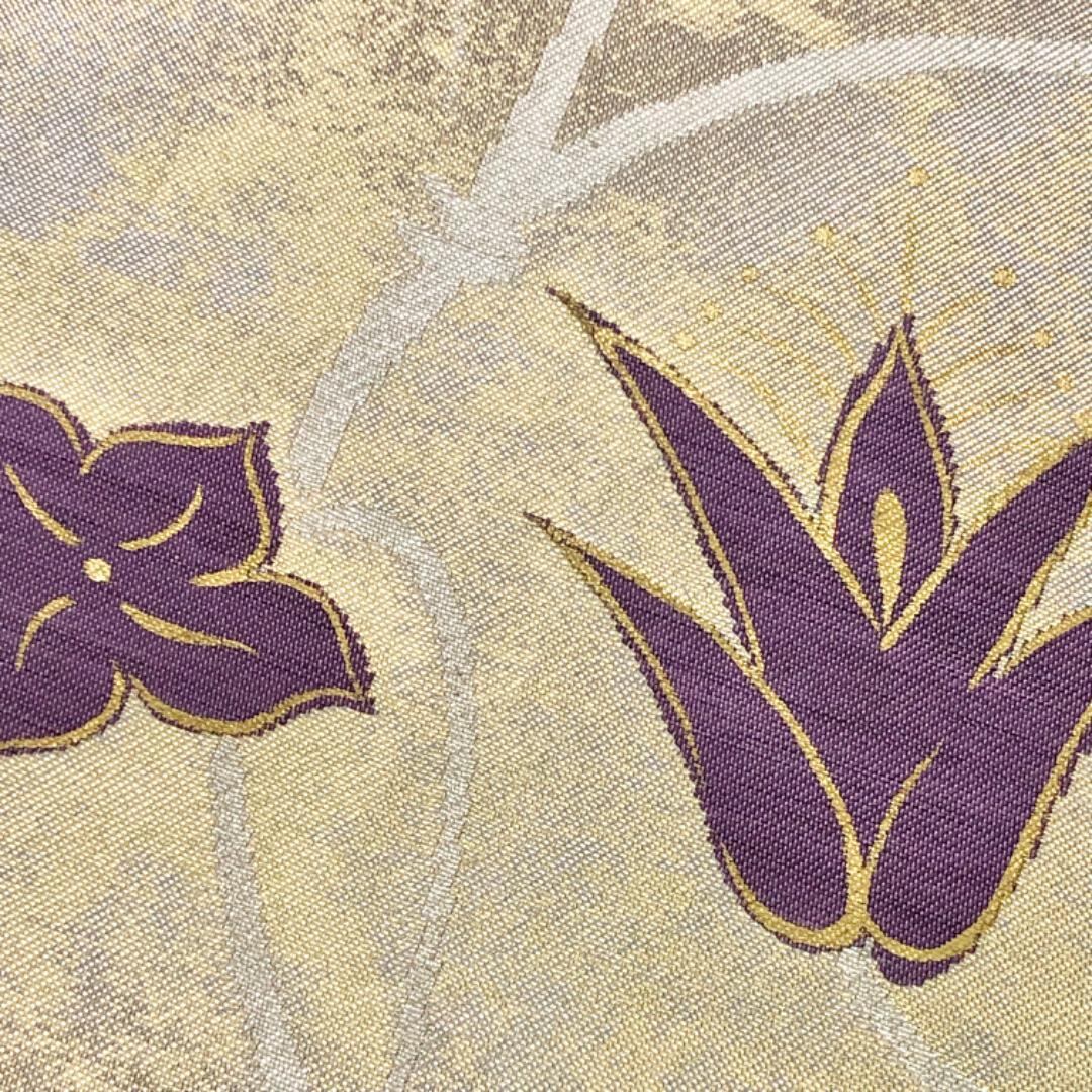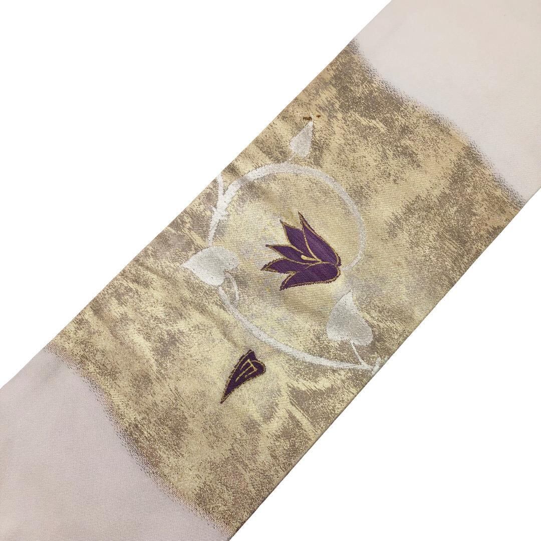 金色ベースの煌びやかなお色味に美しい貝紫が使われた花唐草模様の柄裄がデザインされた素敵なお品でございます。