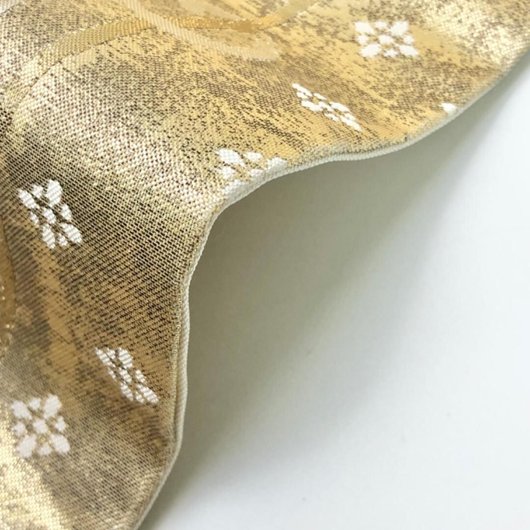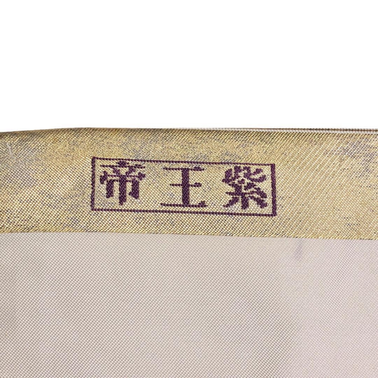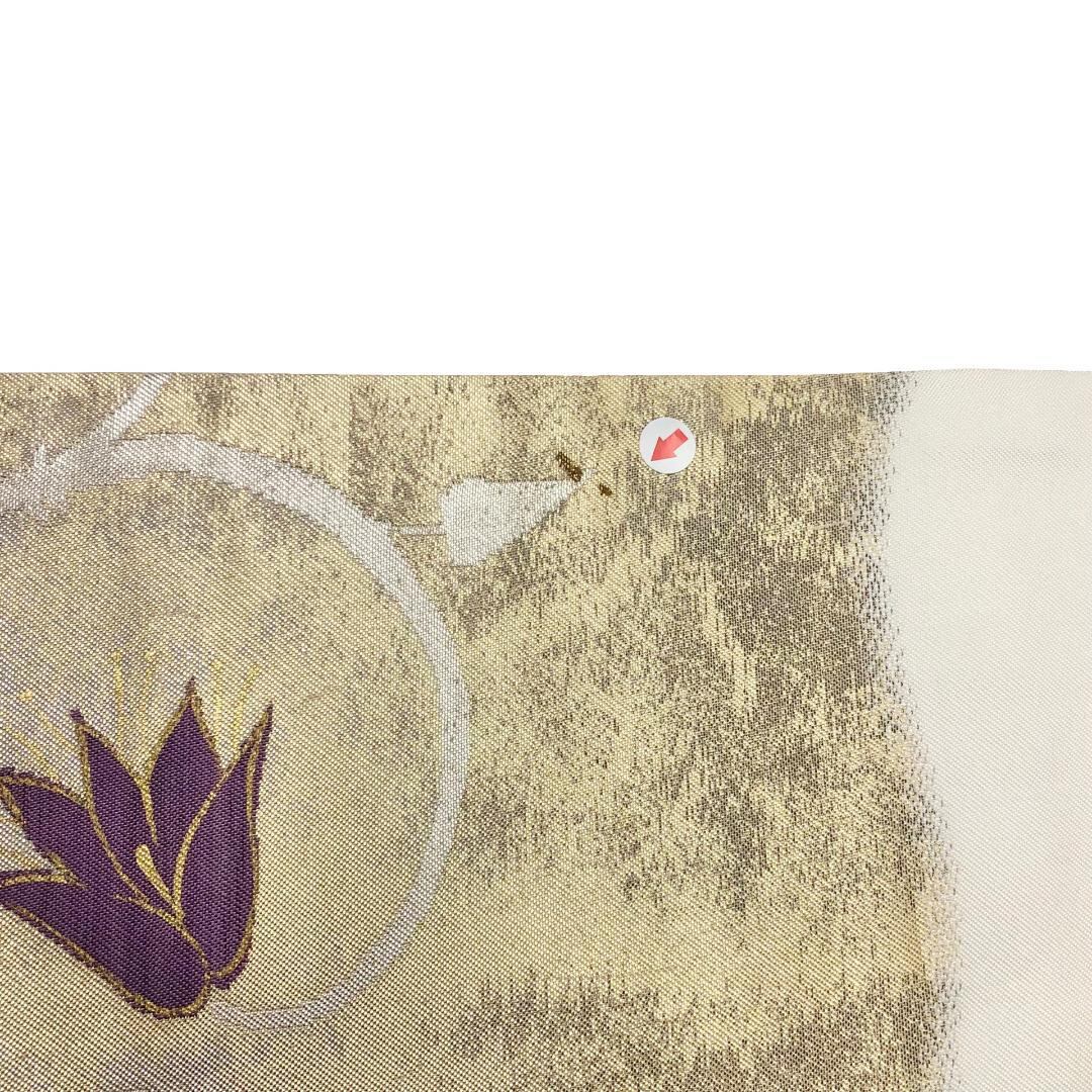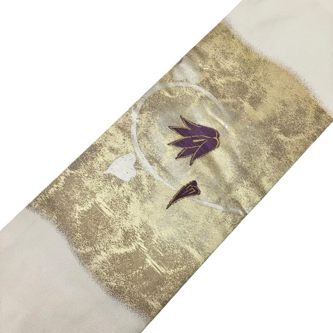 金色ベースの煌びやかなお色味に美しい貝紫が使われた花唐草模様の柄裄がデザインされた素敵なお品でございます。