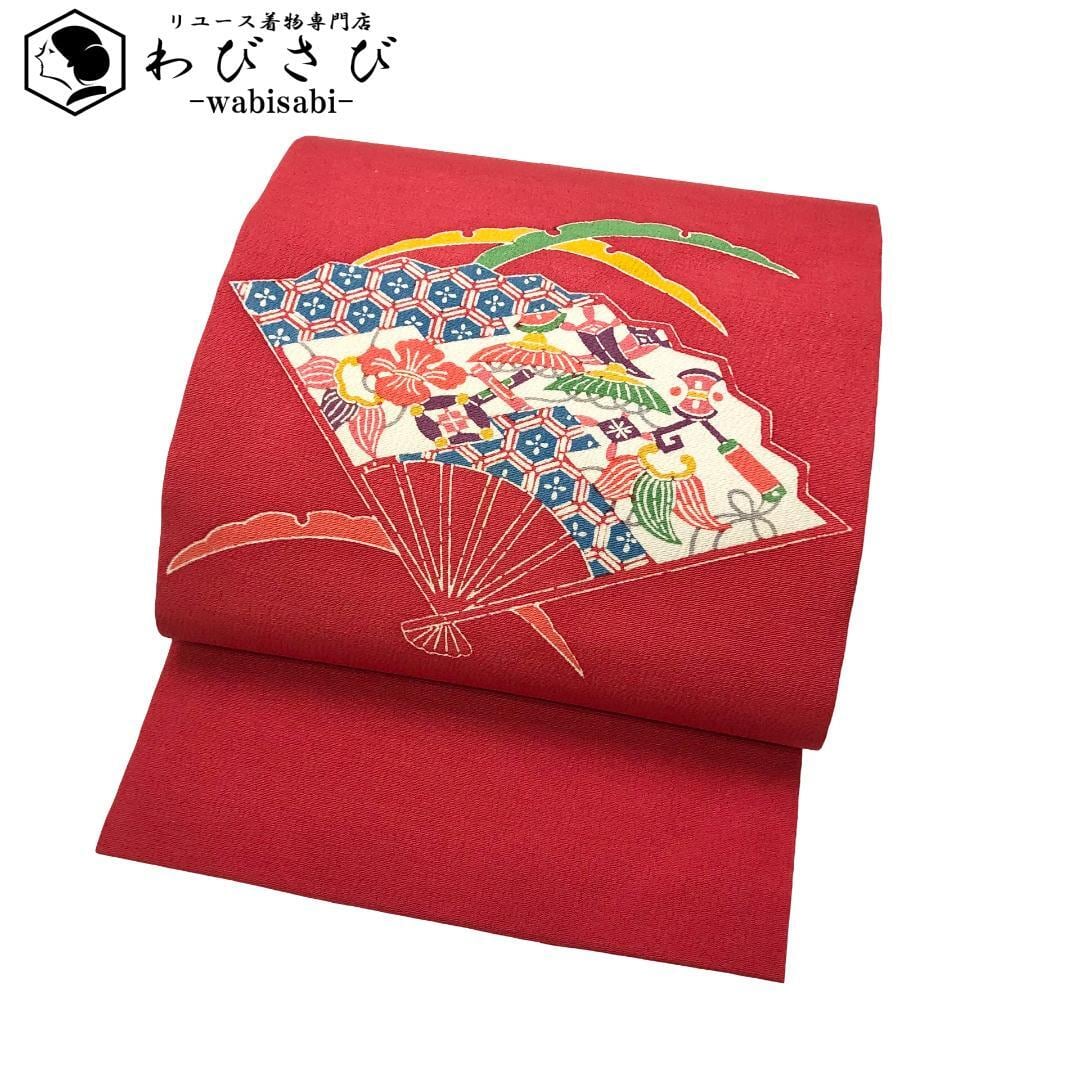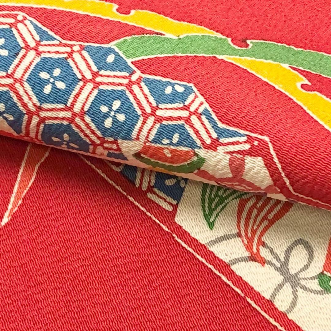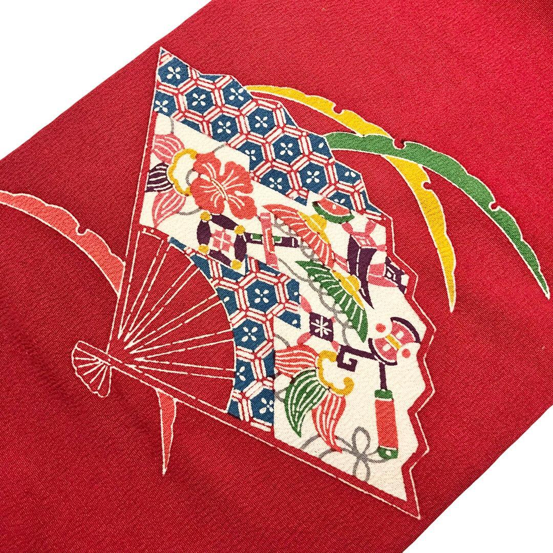 柘榴色のお色味の縮緬地に扇子、宝尽くし、雪芝模様の型染の柄裄がデザインされた雰囲気の良い素敵なお品でございます。