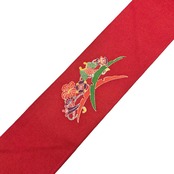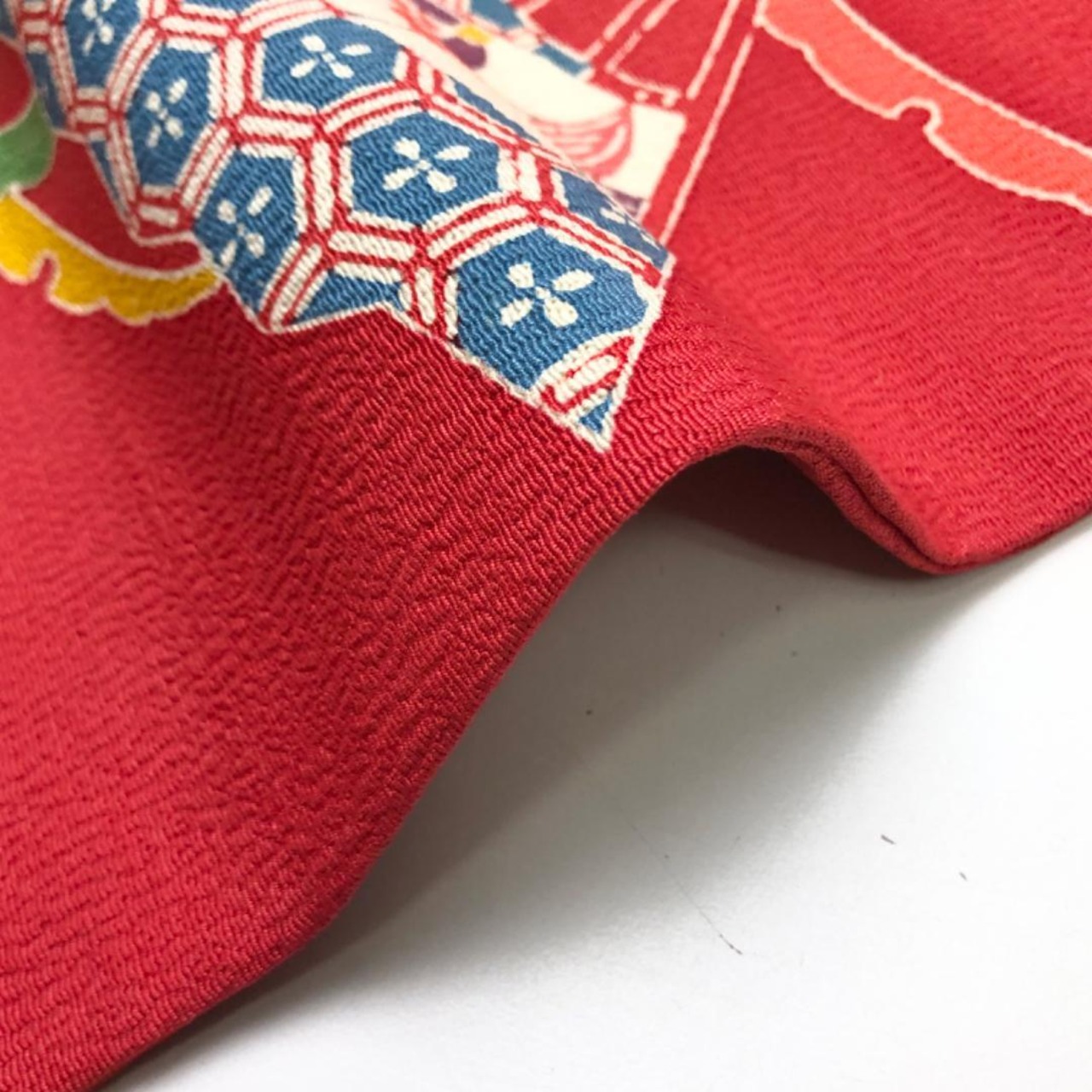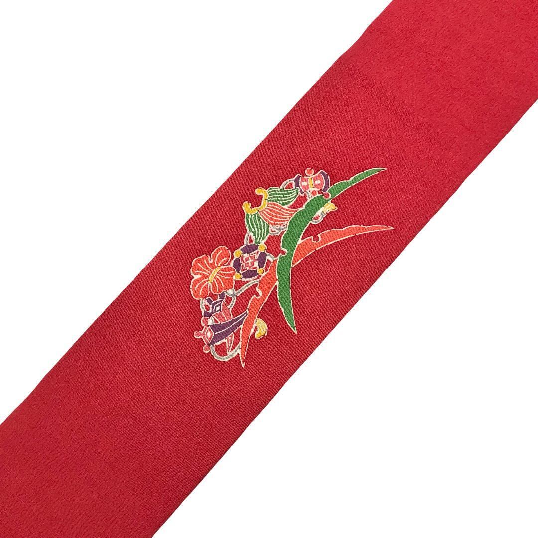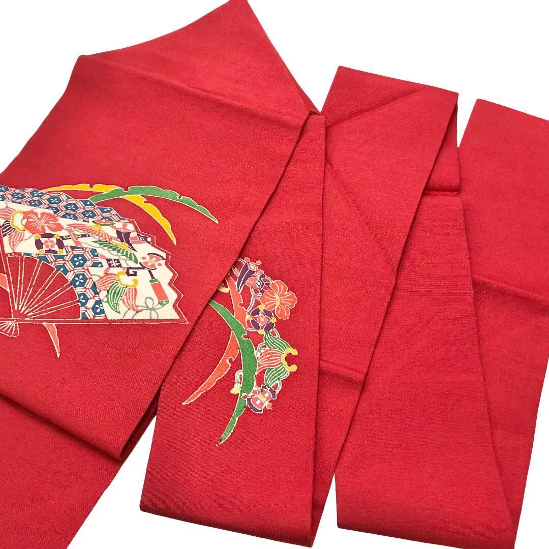 柘榴色のお色味の縮緬地に扇子、宝尽くし、雪芝模様の型染の柄裄がデザインされた雰囲気の良い素敵なお品でございます。