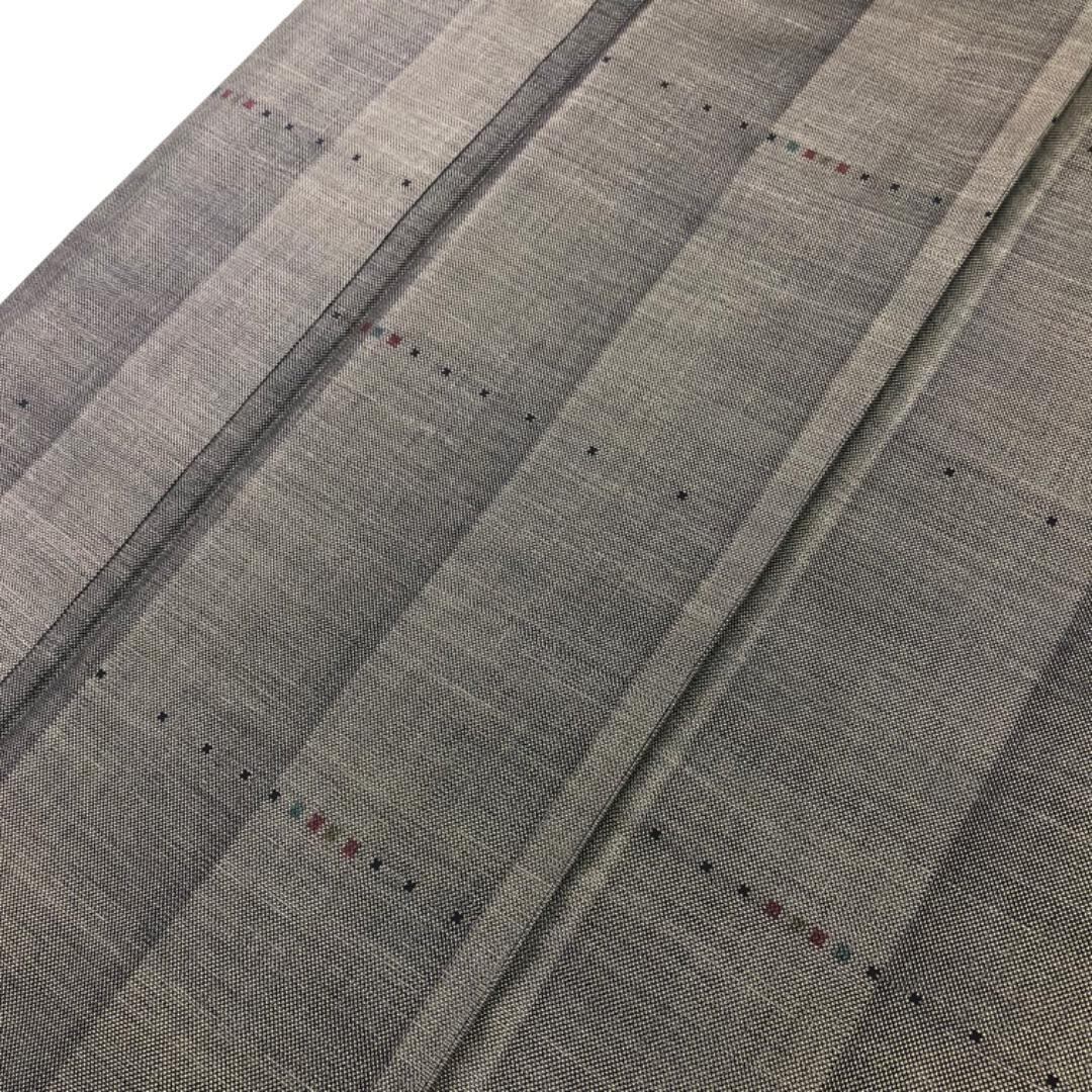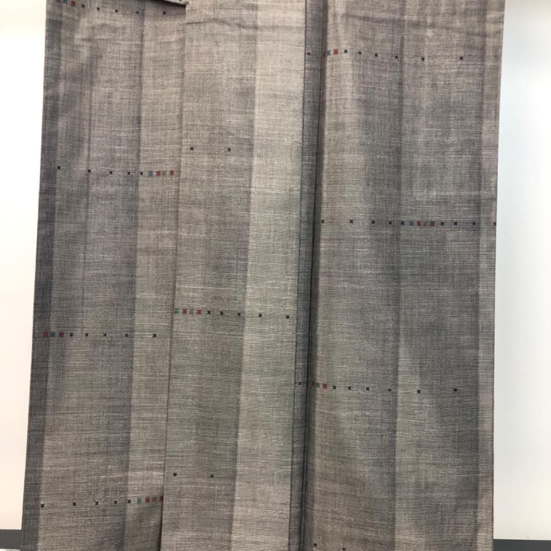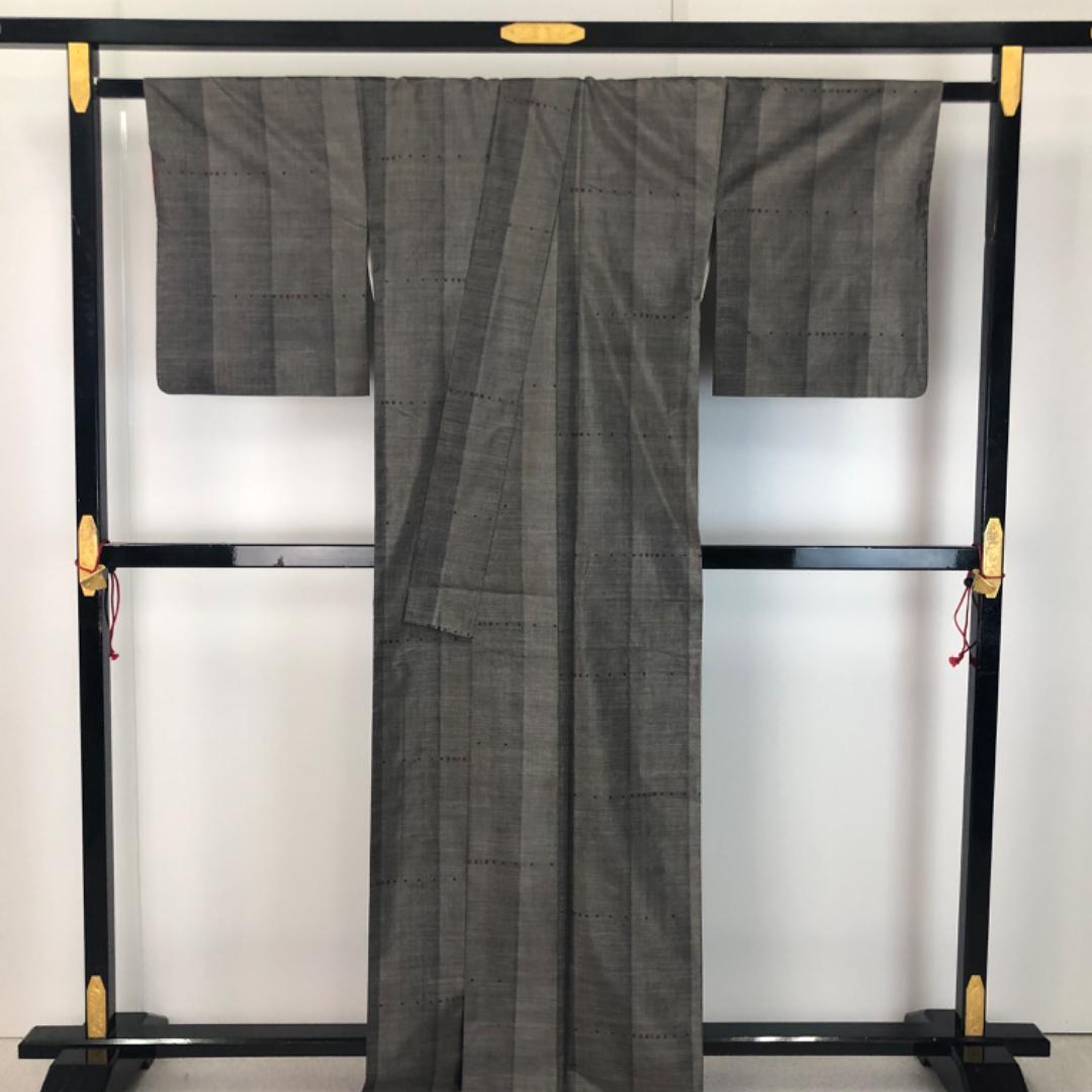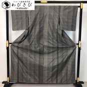 泥染の落ち着きあるお色味に縦縞に小さな四角模様の柄裄がデザインされた素敵なお品でございます。