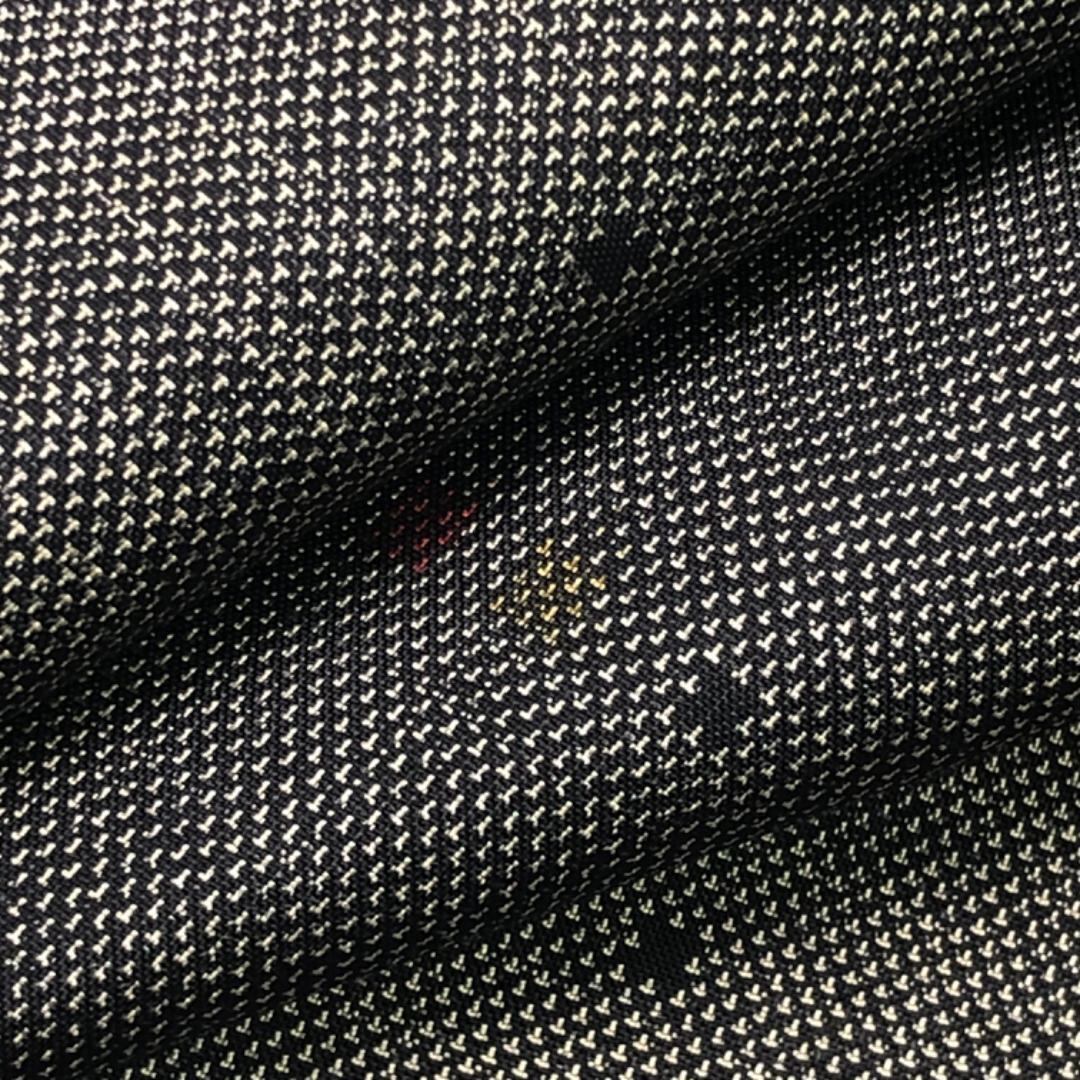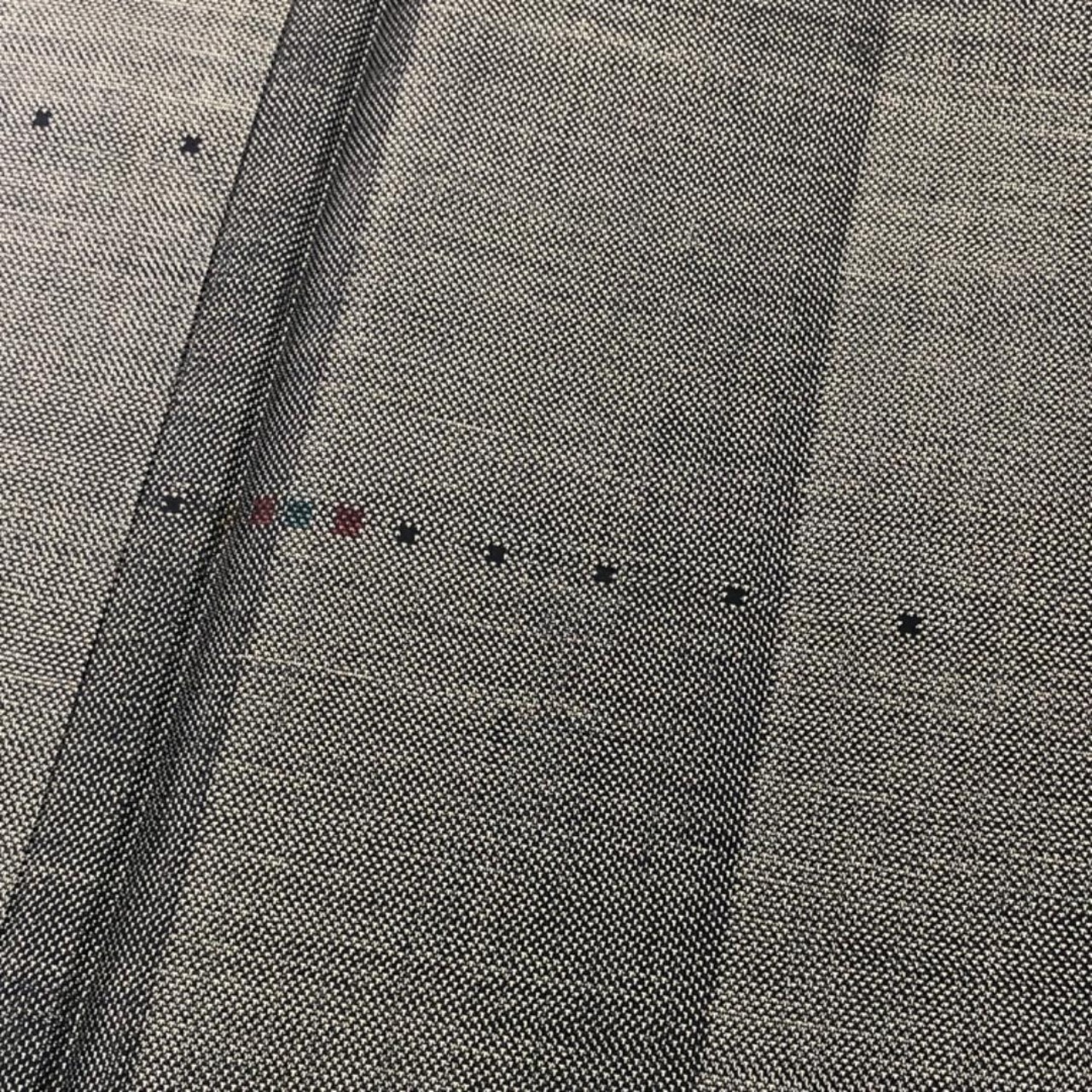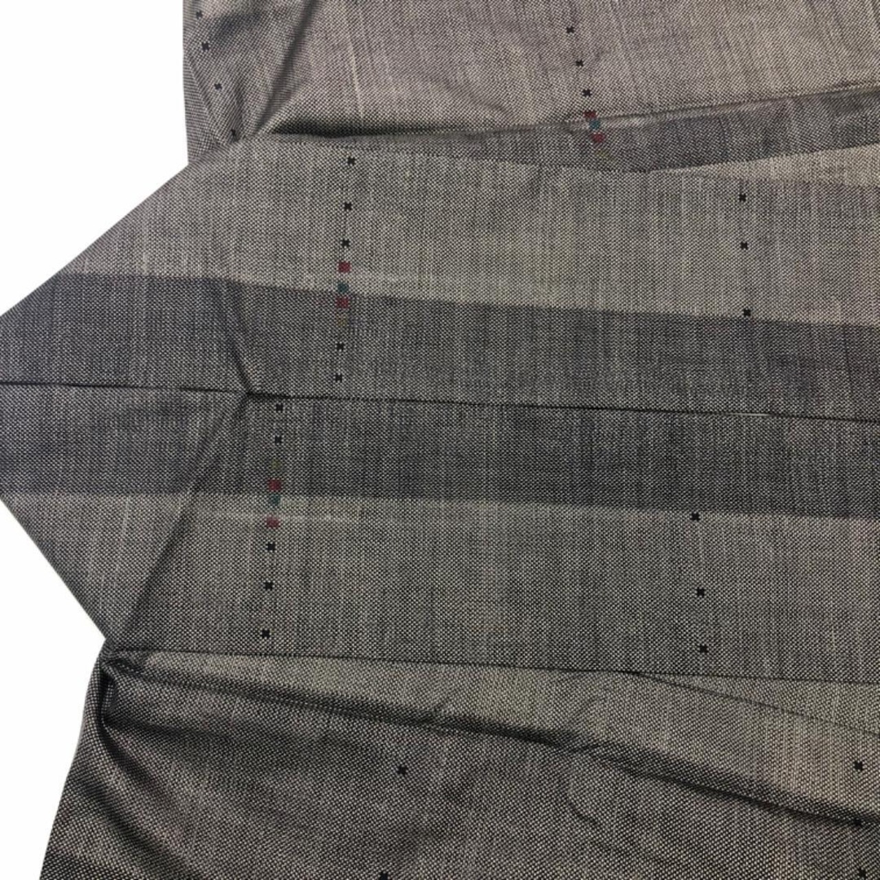 泥染の落ち着きあるお色味に縦縞に小さな四角模様の柄裄がデザインされた素敵なお品でございます。