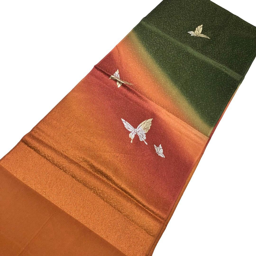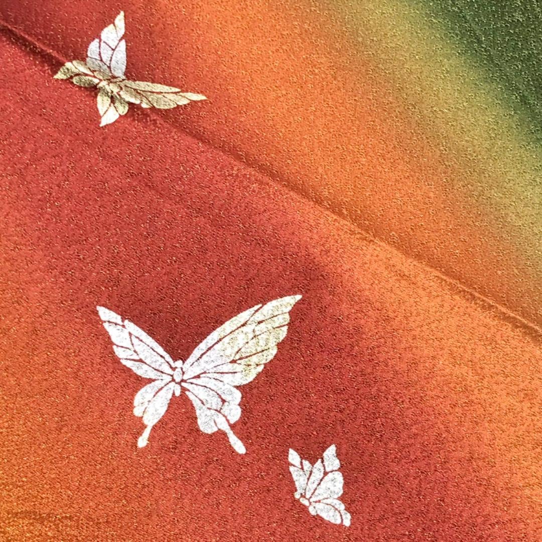 色鮮やかなお色味に美しい蝶々の柄裄がデザインされた金通しの素敵なお品でございます。