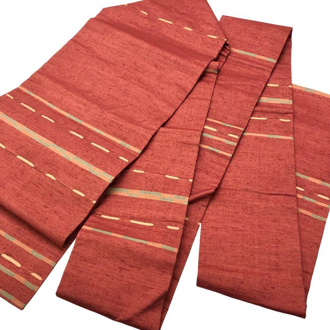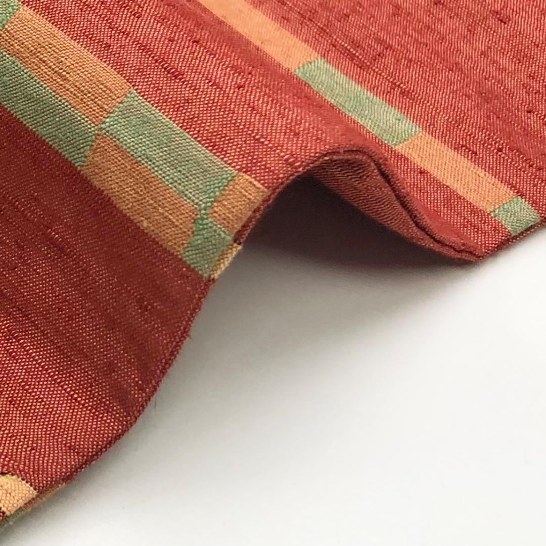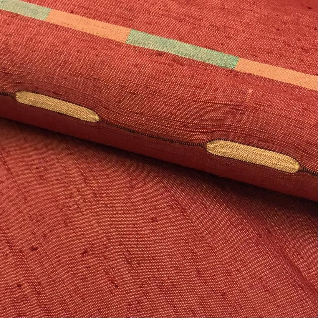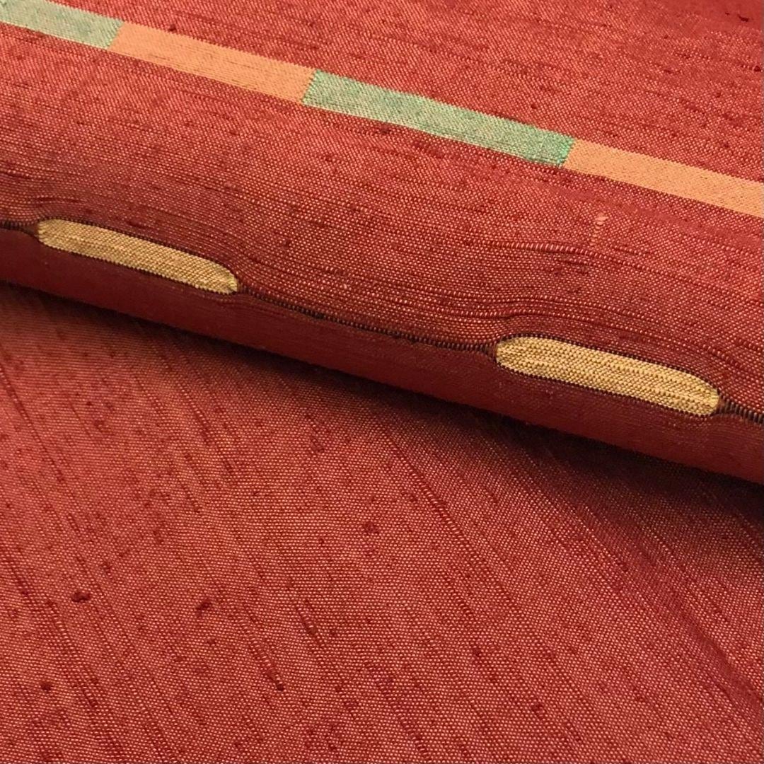 弁柄色のお色味に横縞織模様がデザインされた雰囲気の良い素敵な柄裄のお品でございます。