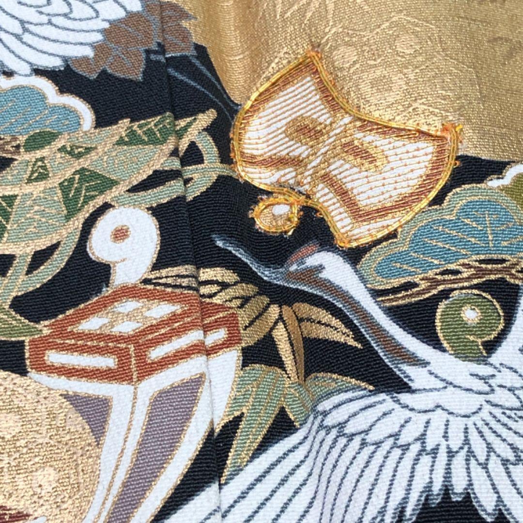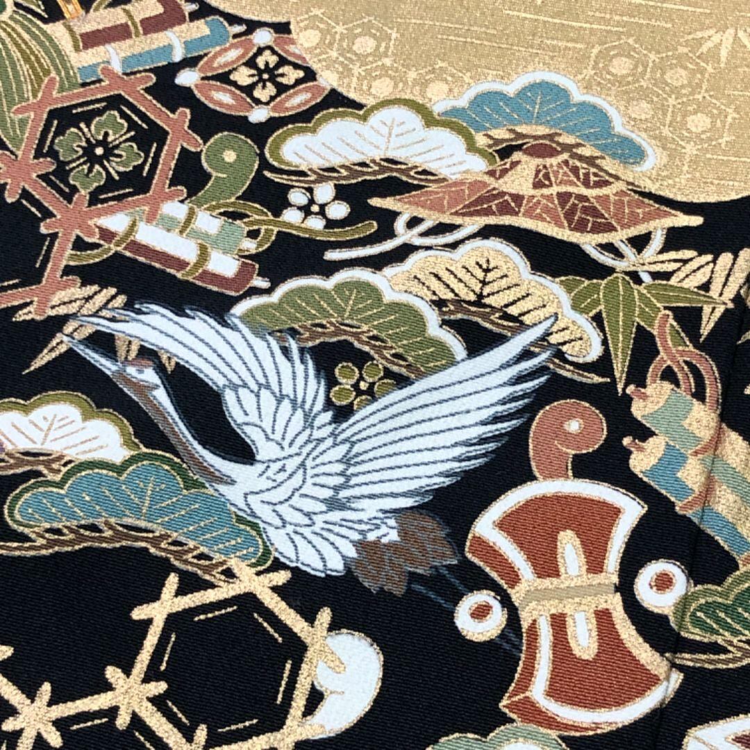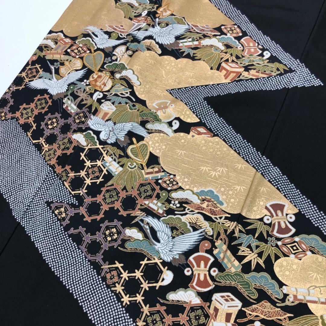 金彩、金駒などが使われた松菱模様、宝尽くし、鶴などのお祝いの席に相応しい素敵な柄裄がデザインされたお品でございます。