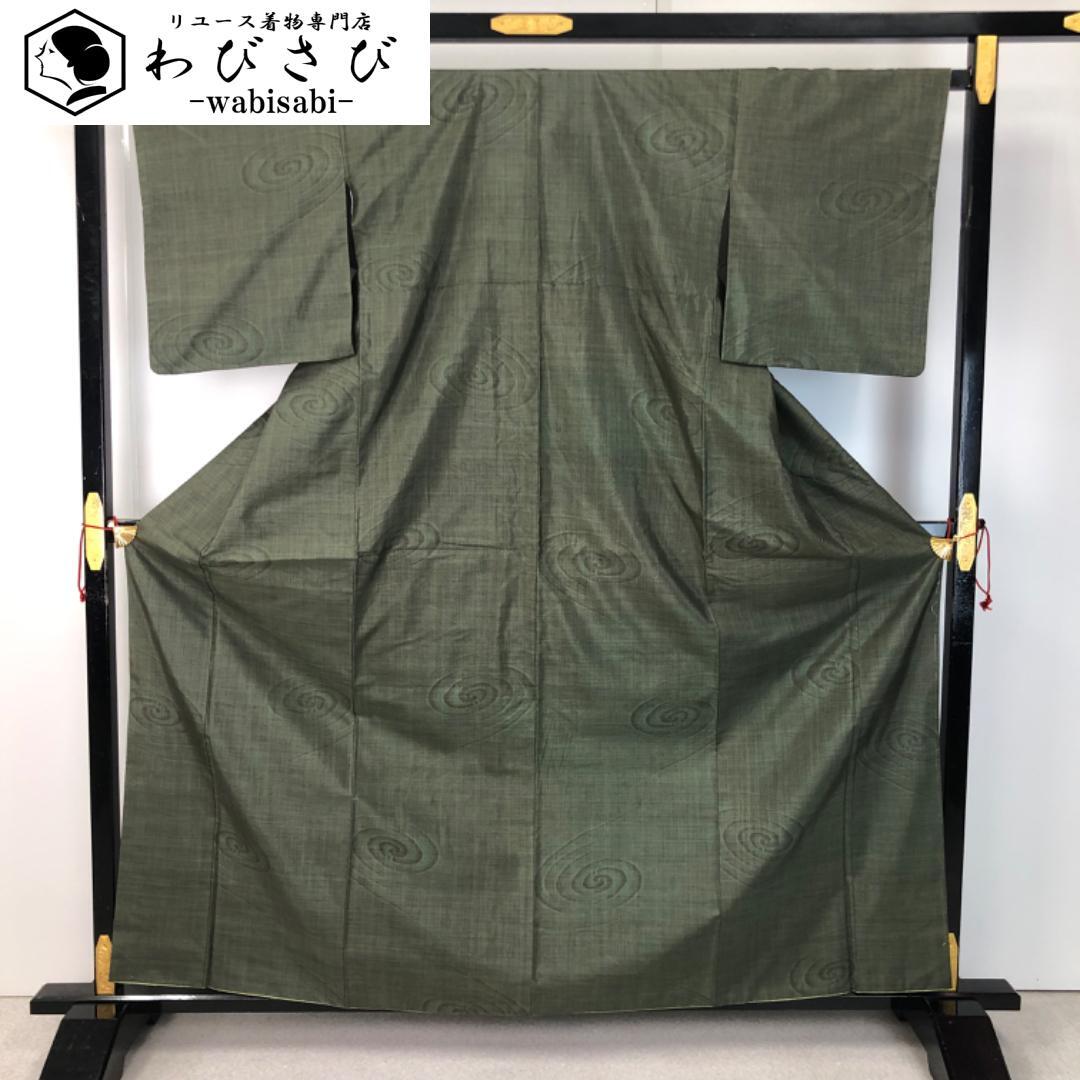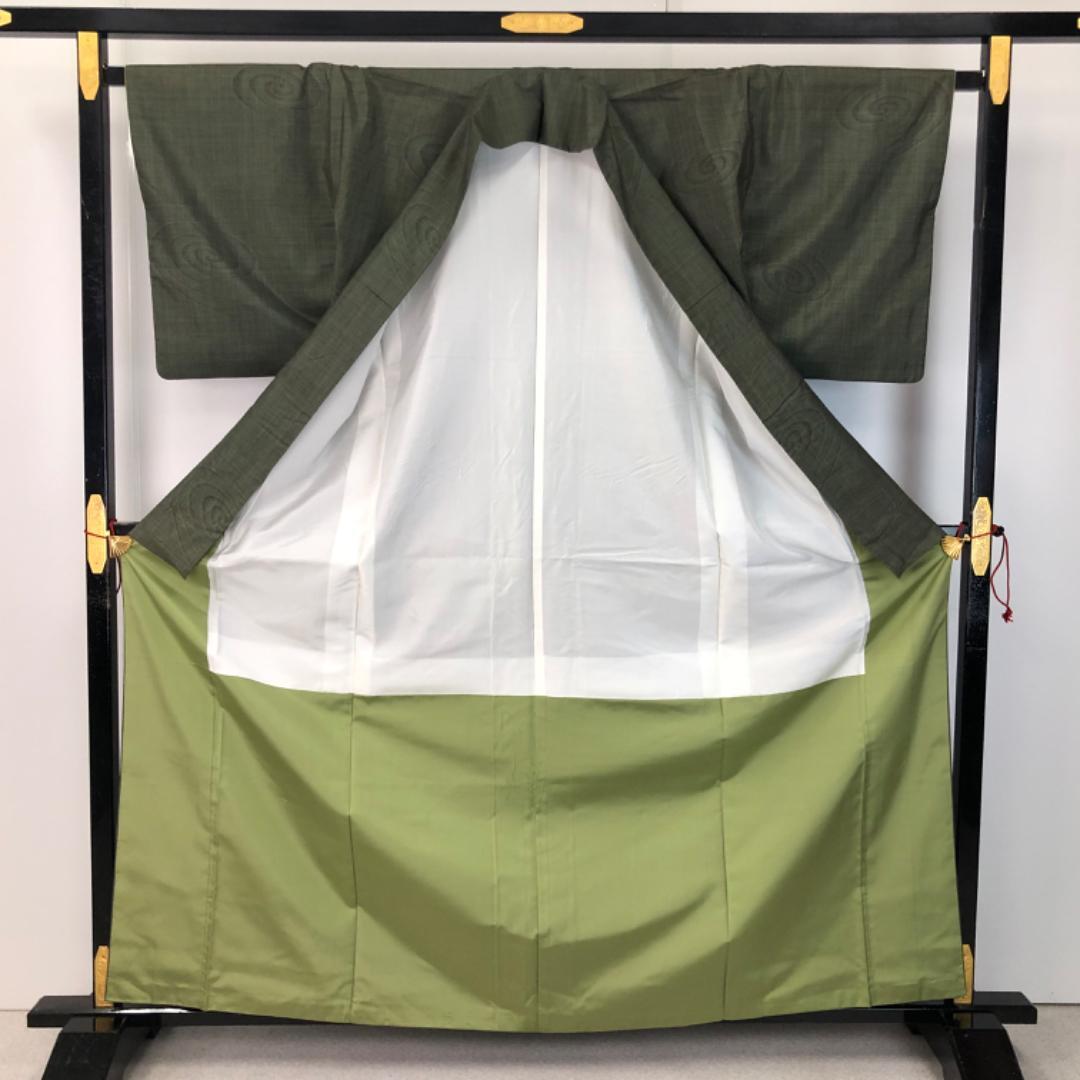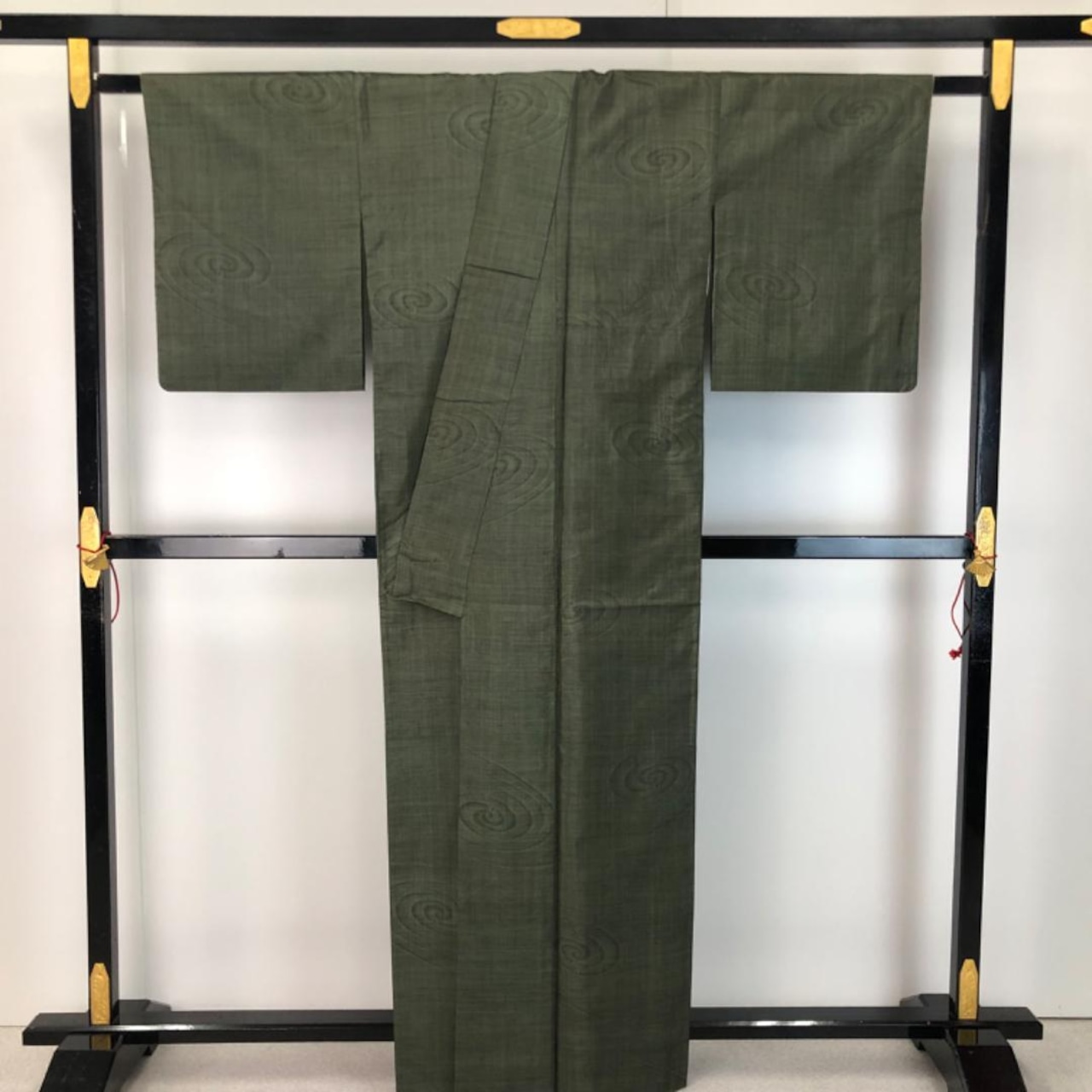 島松鼠色のお色味に渦巻き模様の柄裄がデザインされた雰囲気の良い素敵なお品でございます。
