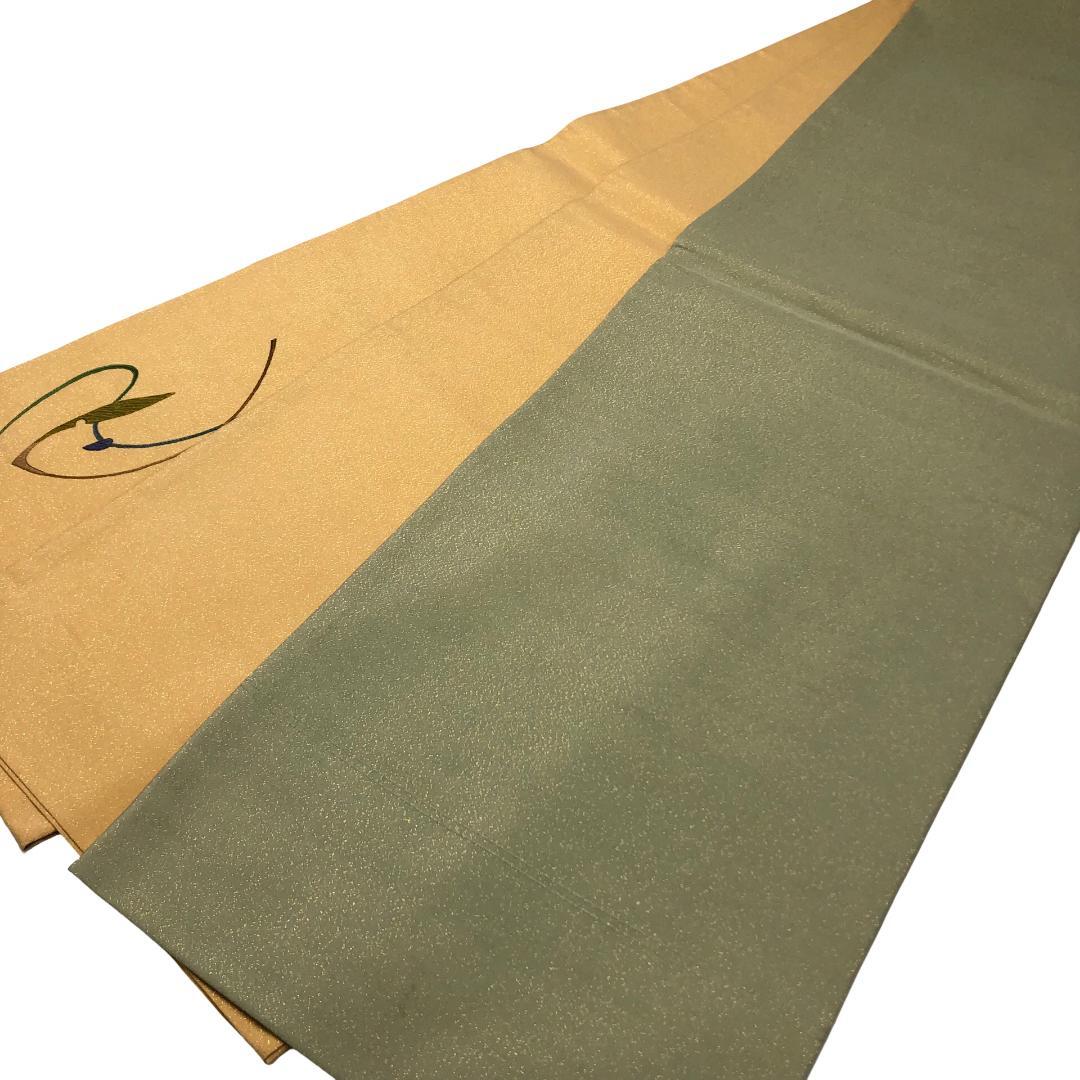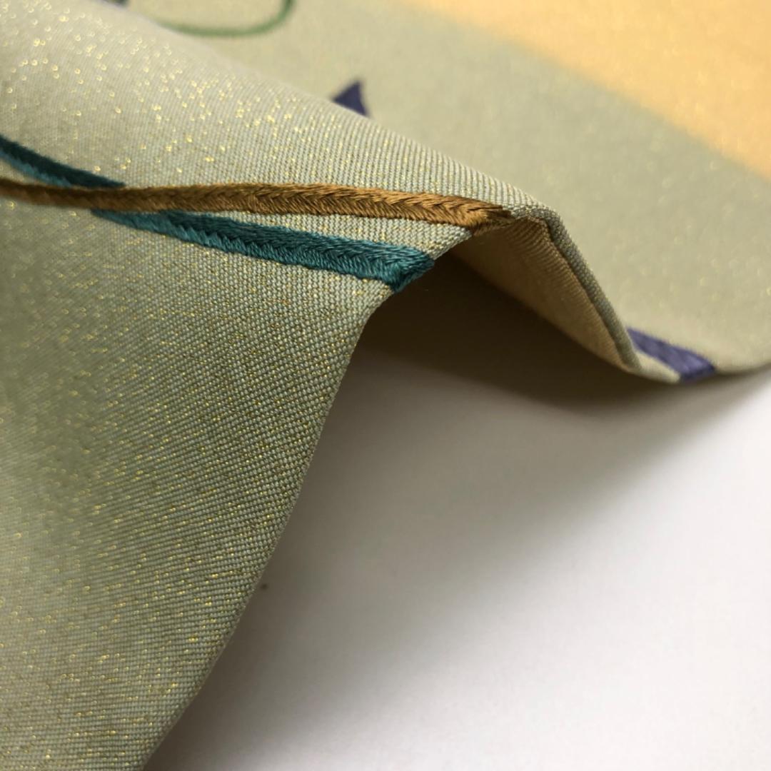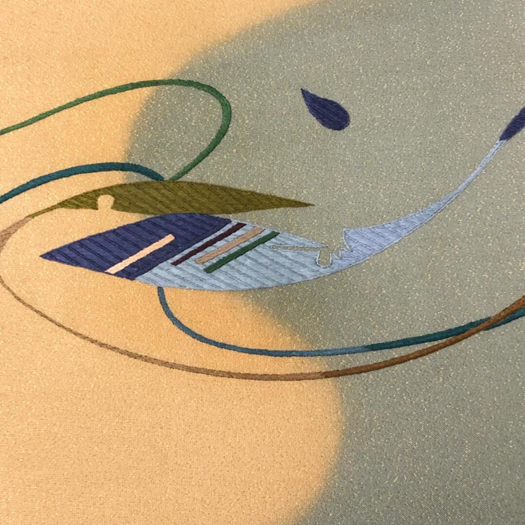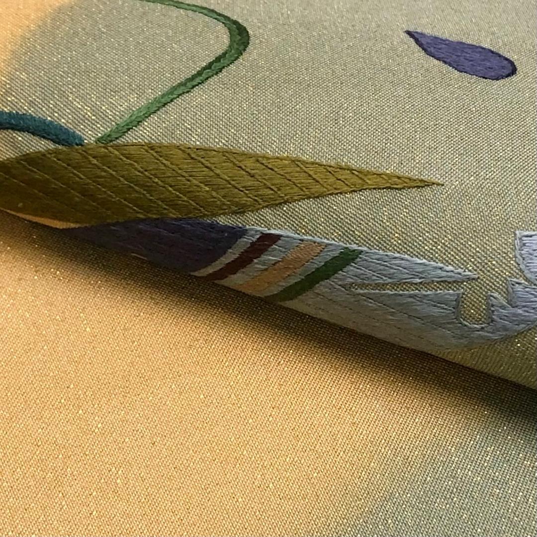 薄柑子色、利休色の染分けのお色味に刺繍の抽象葉模様がデザインされた雰囲気の良い素敵な柄裄のお品でございます。