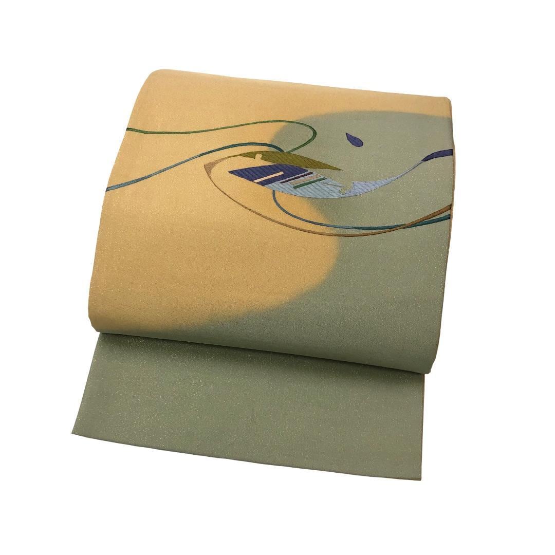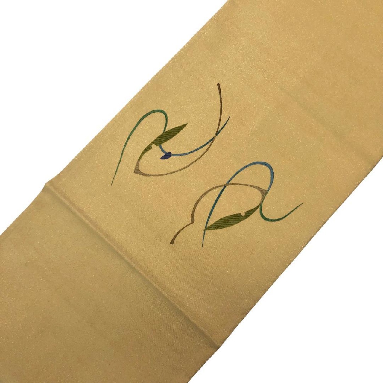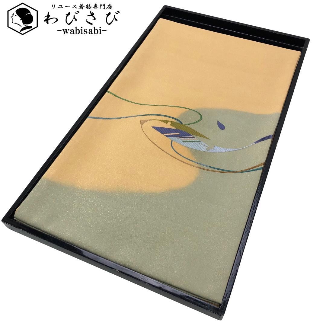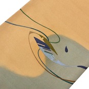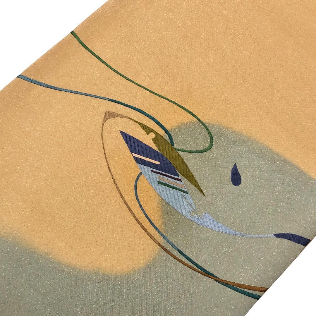 薄柑子色、利休色の染分けのお色味に刺繍の抽象葉模様がデザインされた雰囲気の良い素敵な柄裄のお品でございます。