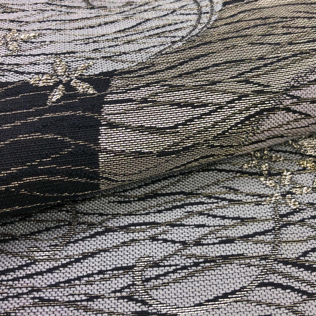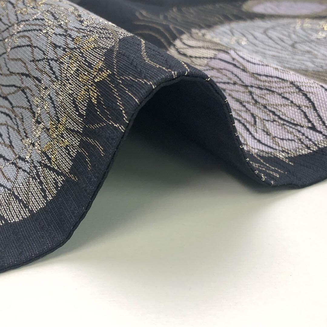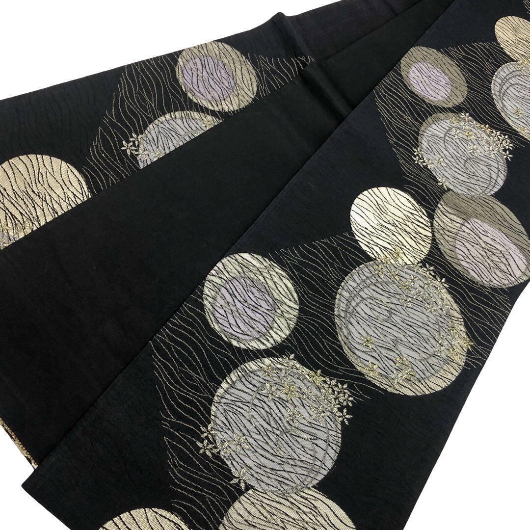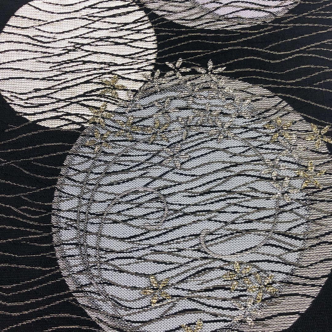 黒色ベースのお色味、丸に草花模様のモダンな雰囲気の柄裄がデザインされた素敵なお品でございます。