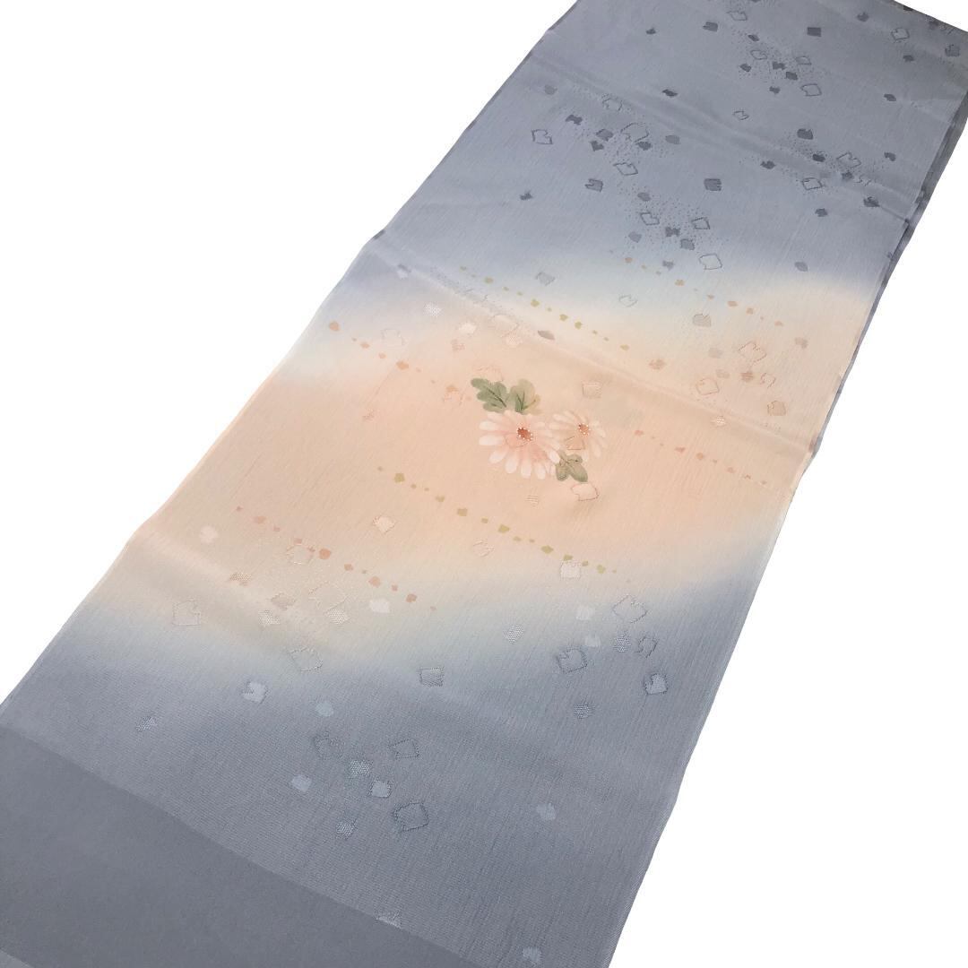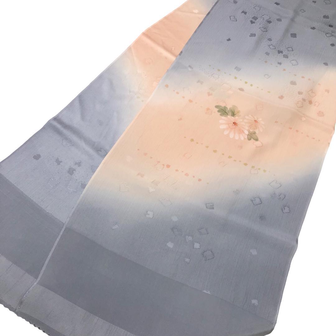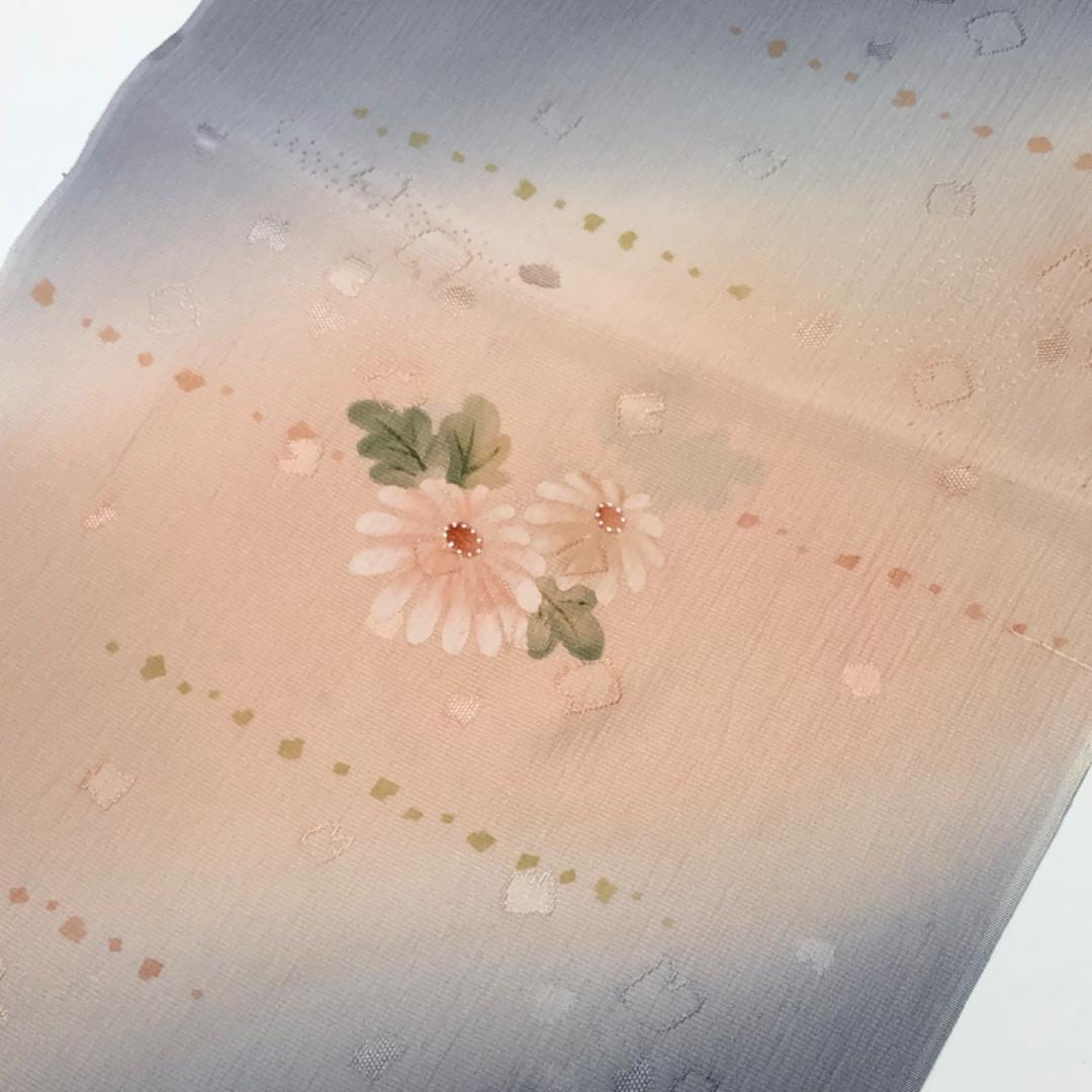 薄鈍色ベースの染分けのお色味に花模様の柄裄がデザインされた素敵なお品でございます。