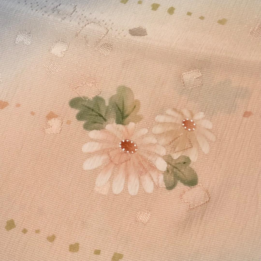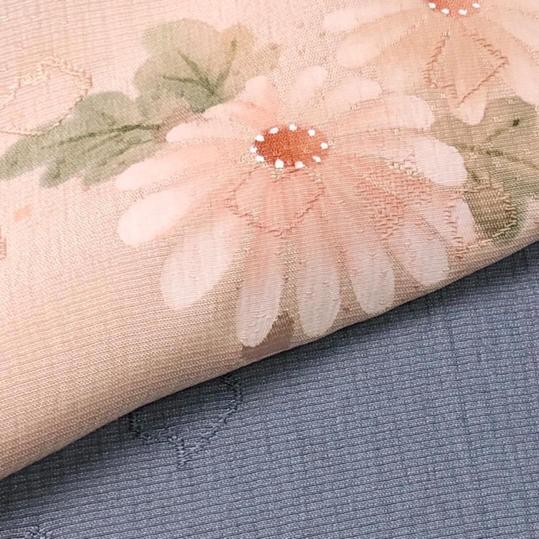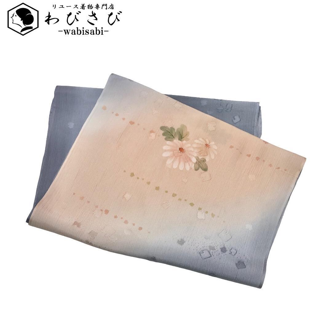 薄鈍色ベースの染分けのお色味に花模様の柄裄がデザインされた素敵なお品でございます。
