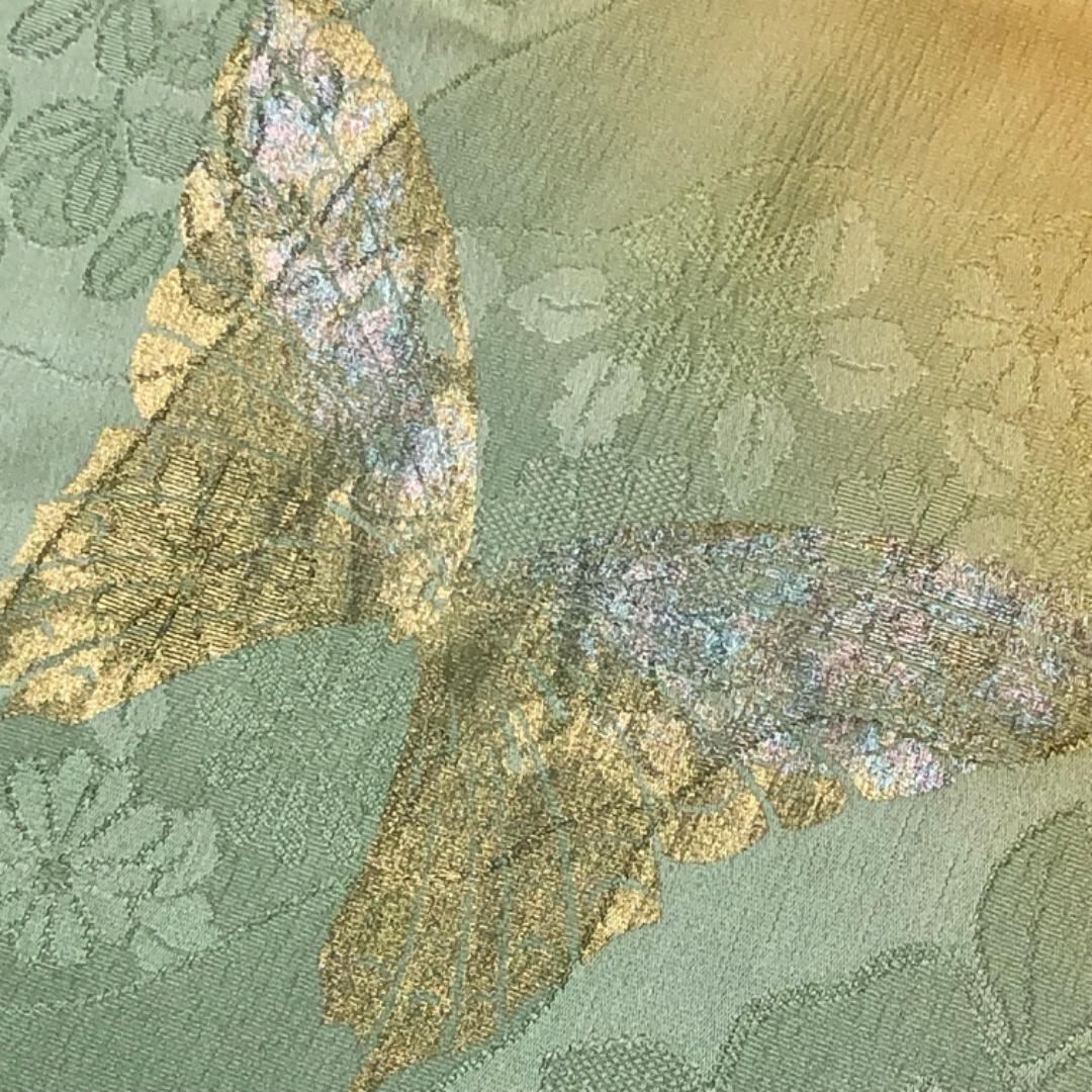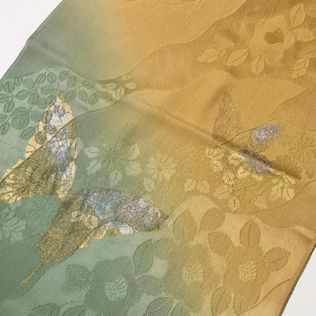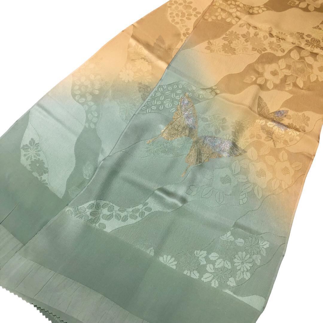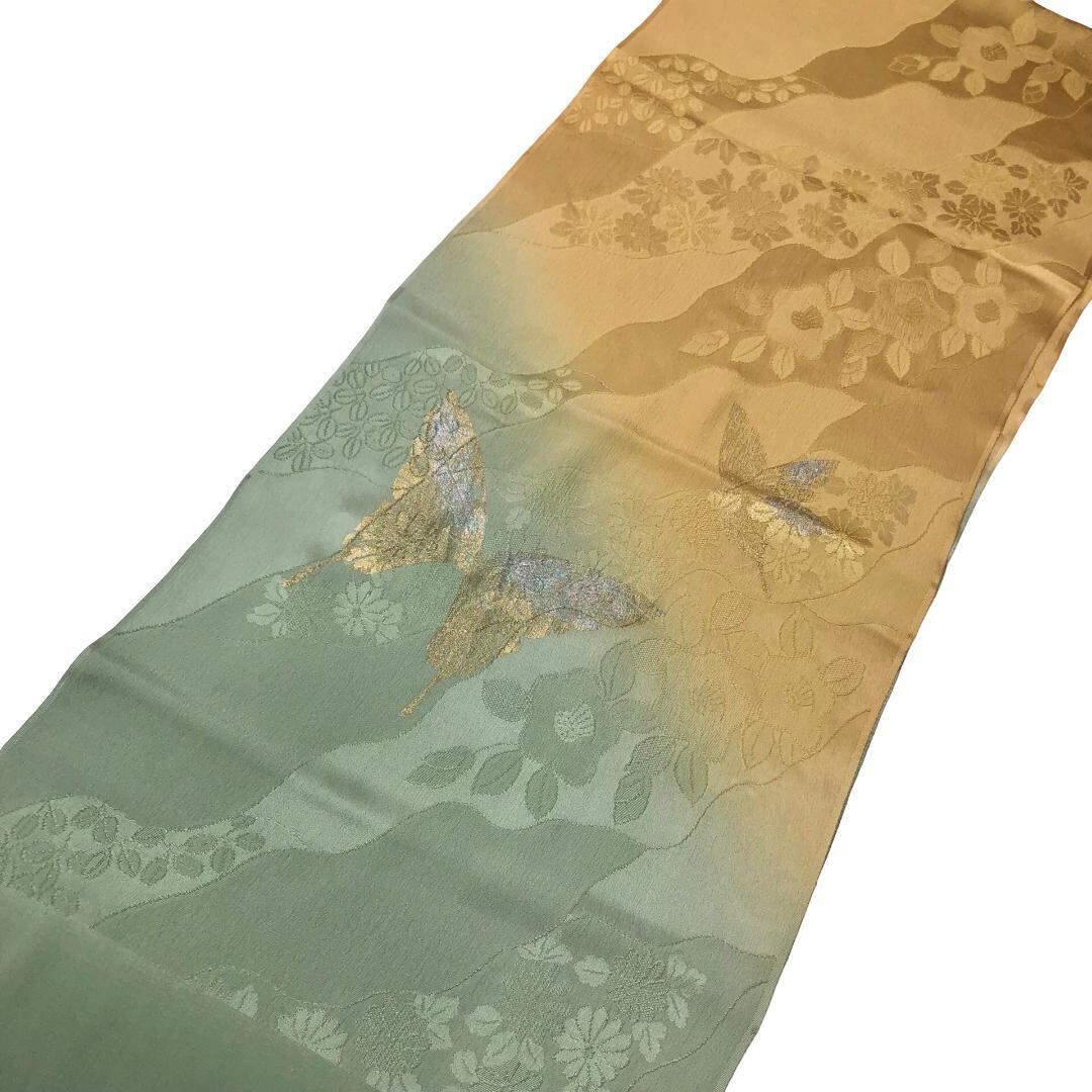 岩井茶色ベースの染分けのお色味に美しい蝶々、花柄などがデザインされた素敵なお品ででございます。