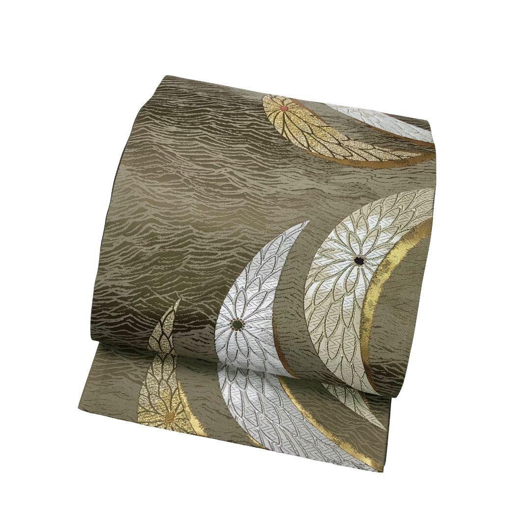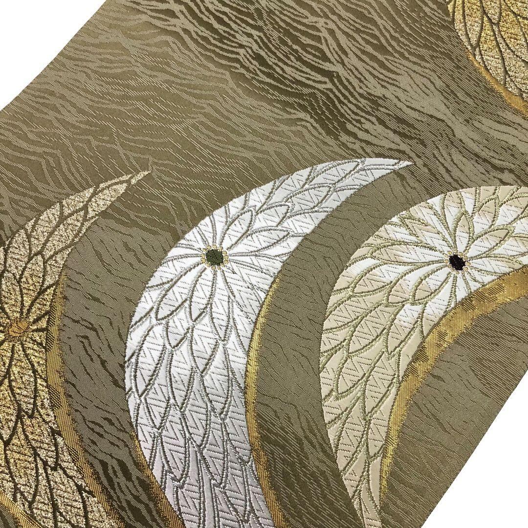 袋帯 三日月に菊の花模様 古茶色 金糸 O-5922 着物 きもの kimono 和服 和装 中古 リサイクル着物 【送料無料】