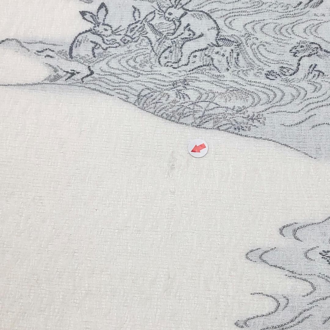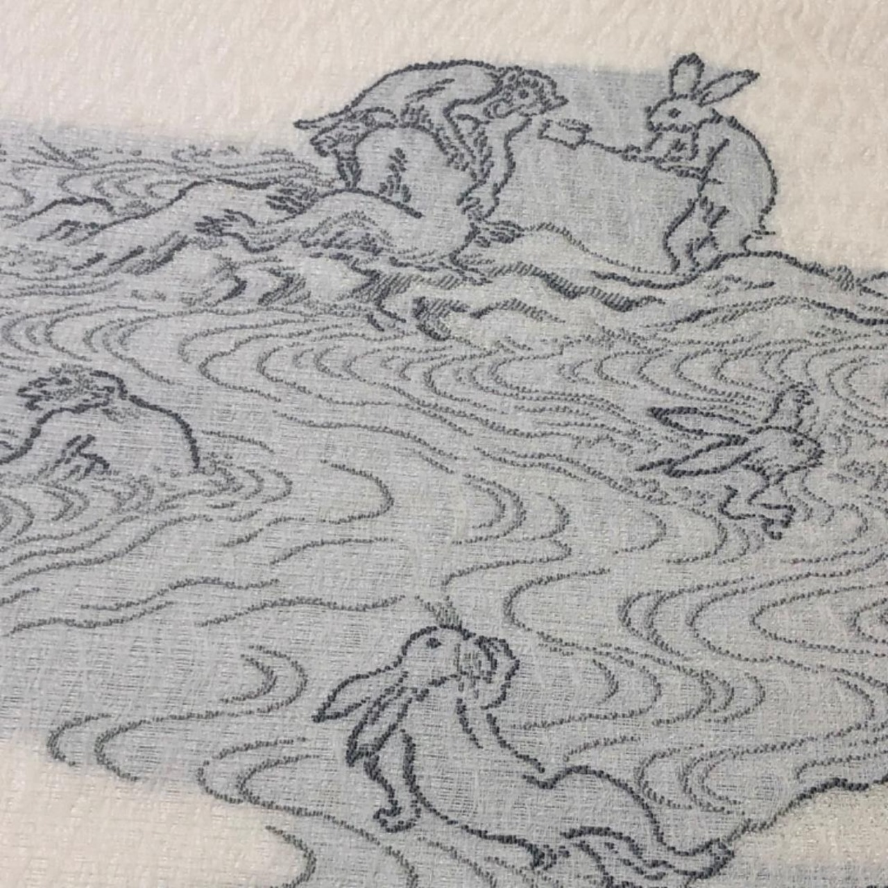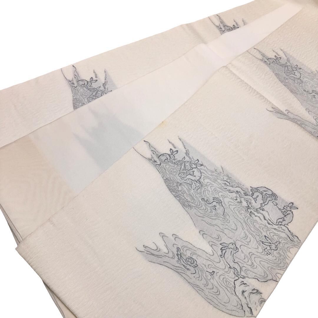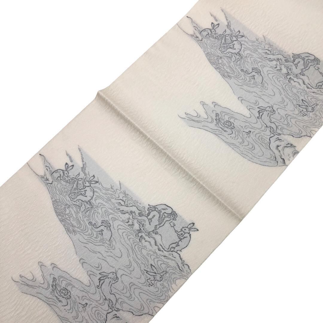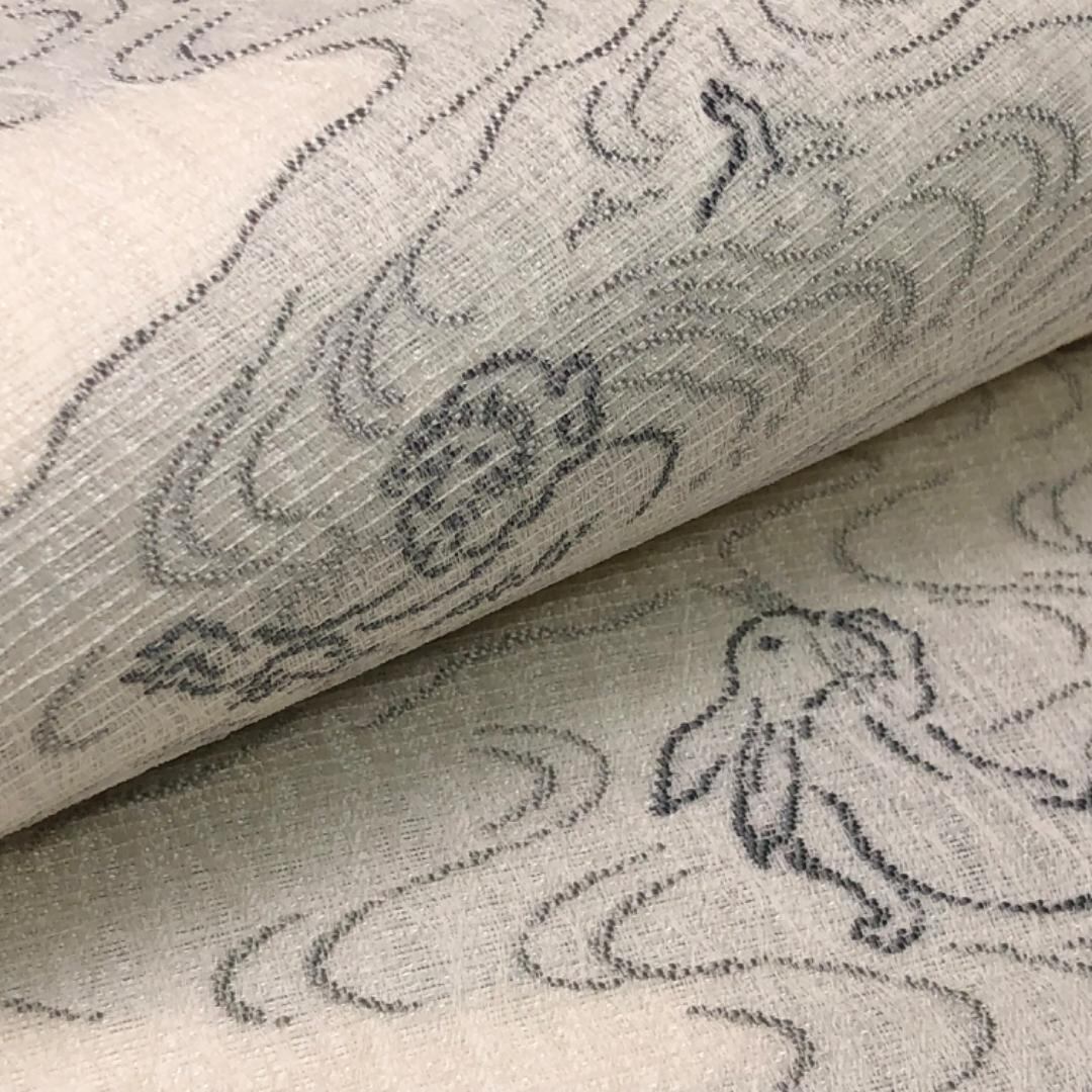乳白色の上品なお色味に織柄の鳥獣戯画の柄行がデザインされた雰囲気の良い素敵なお品でございます。