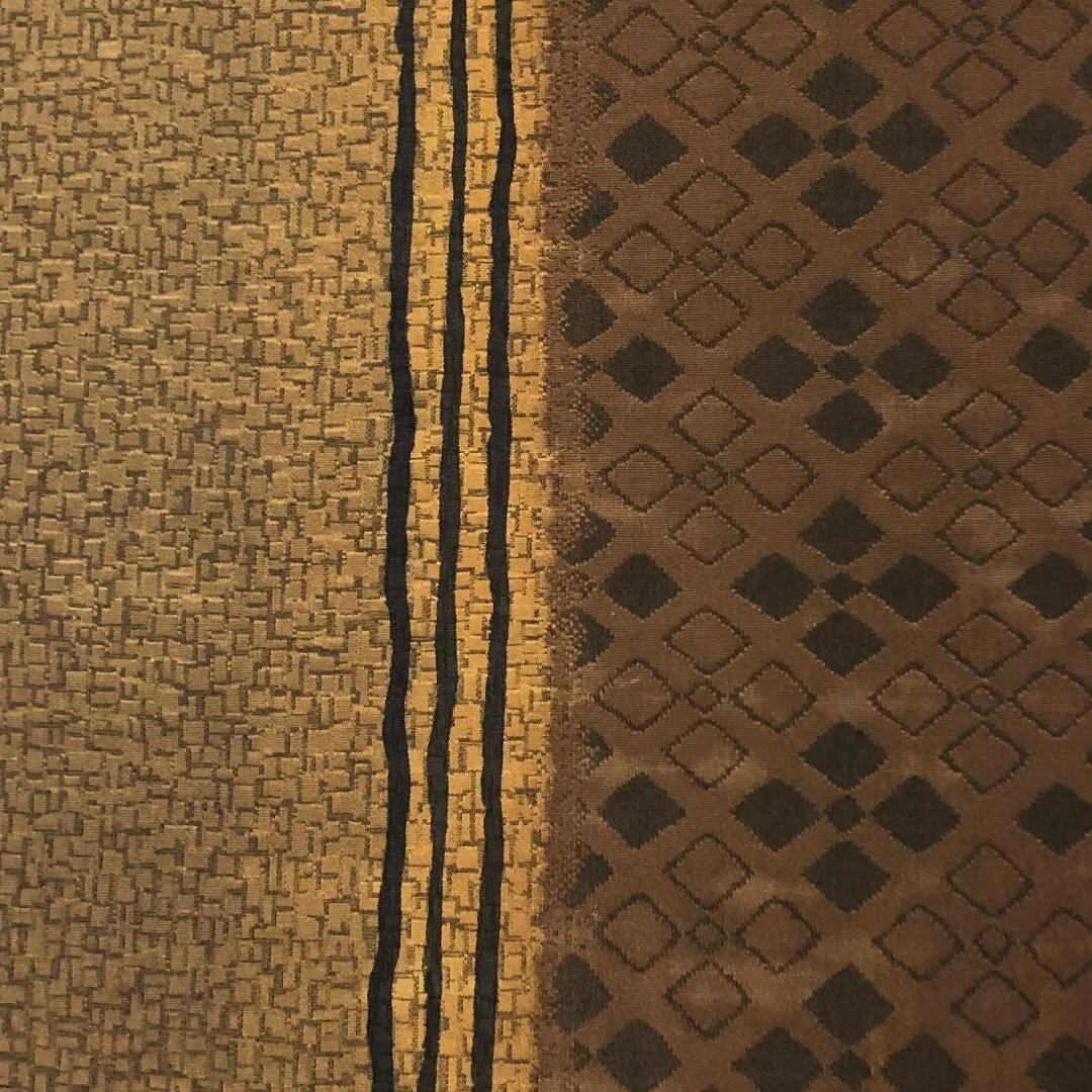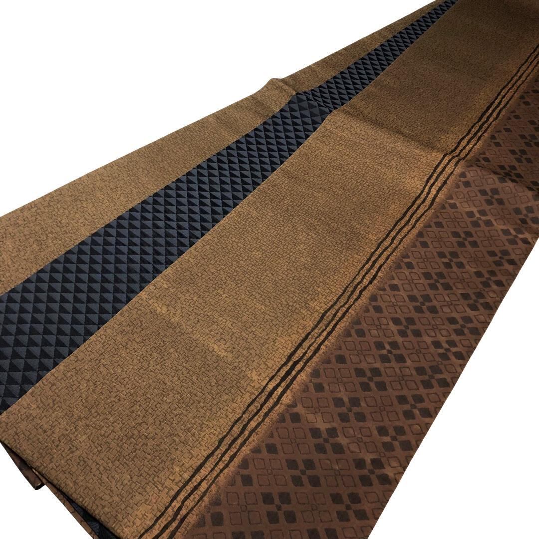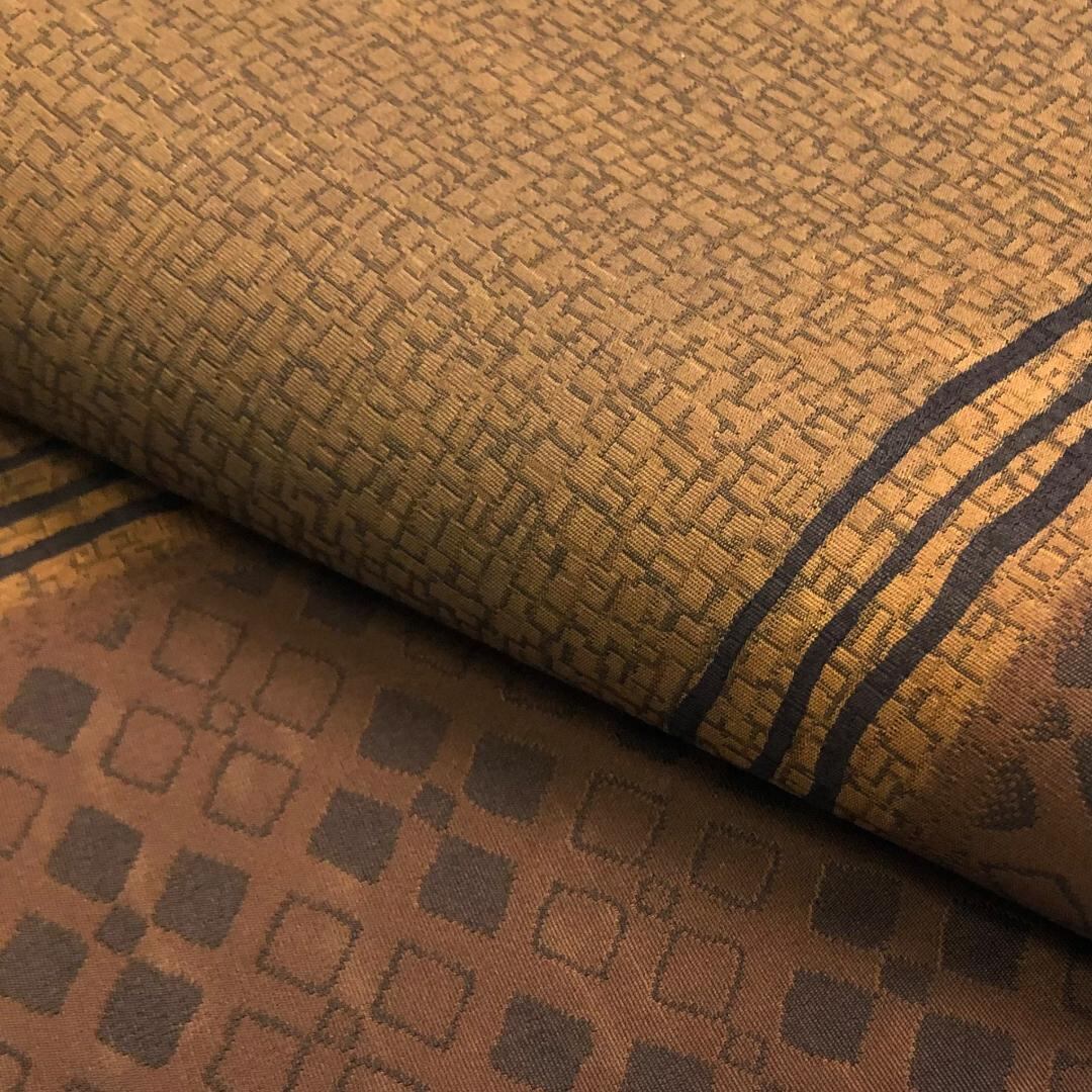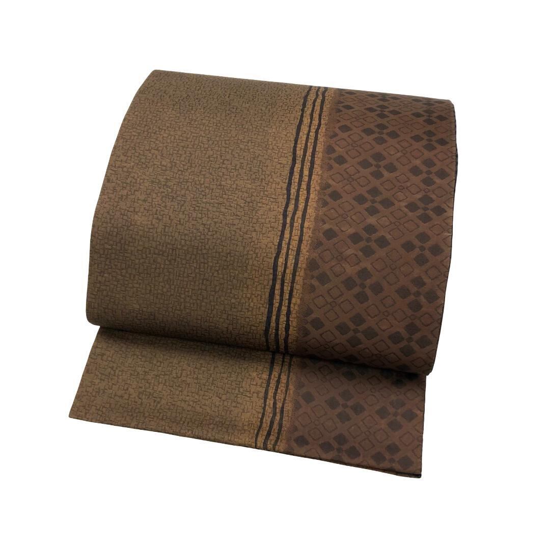 脂燭色のお色味に縦縞に四角の花模様の雰囲気の良い柄行がデザインされた素敵なお品でございます。