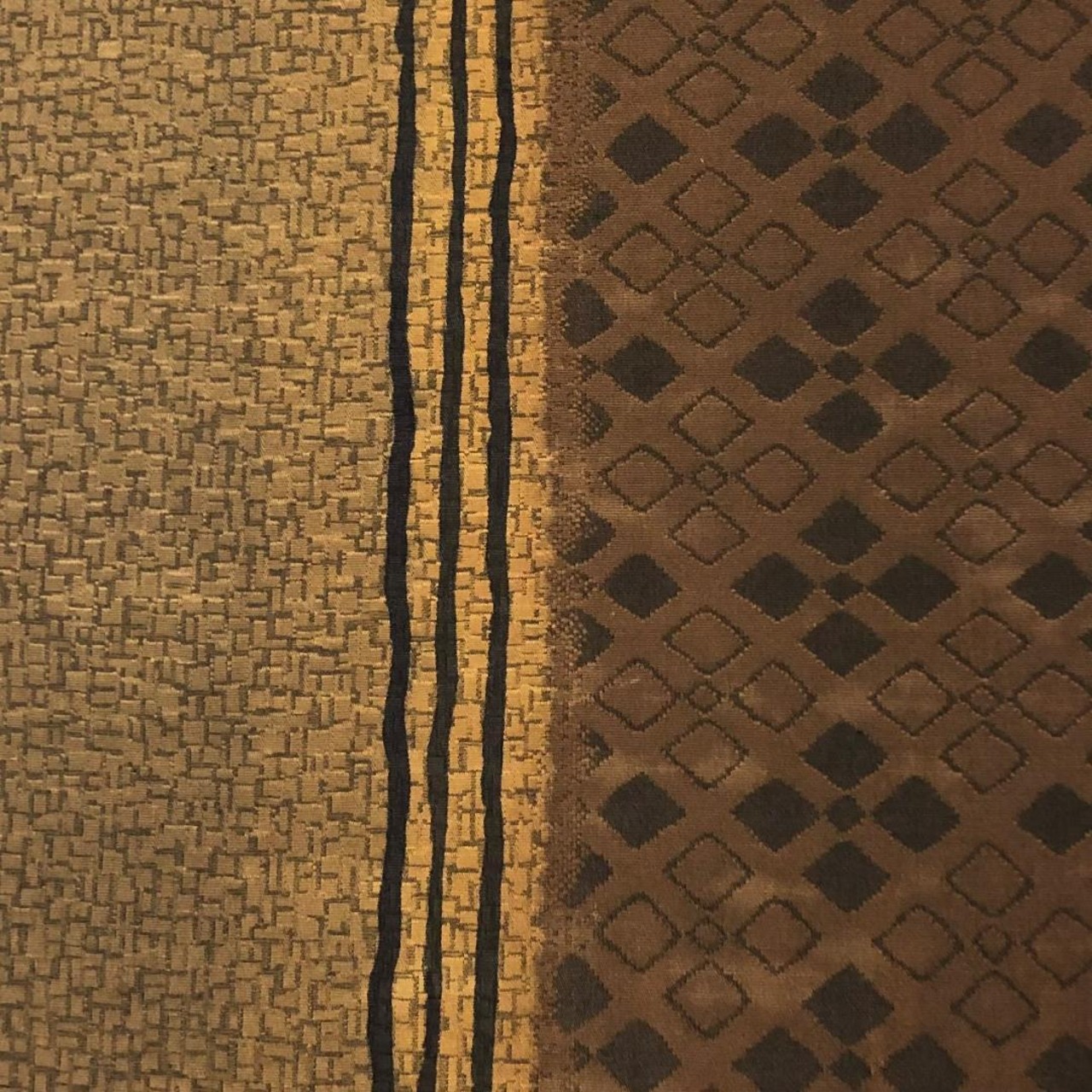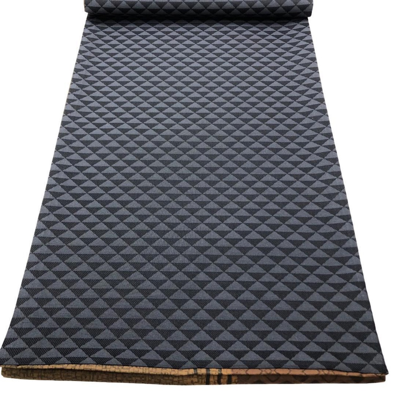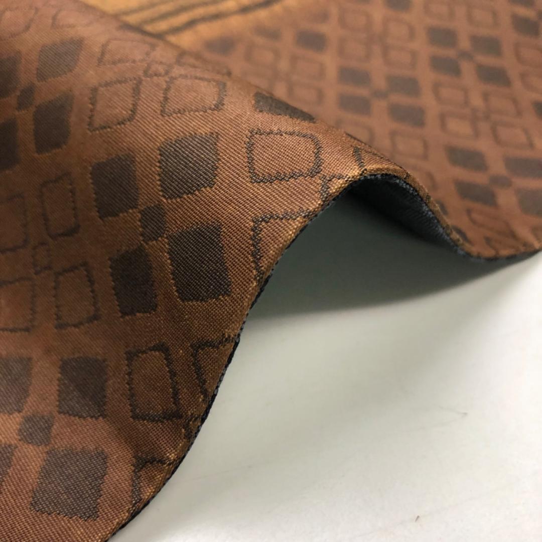 脂燭色のお色味に縦縞に四角の花模様の雰囲気の良い柄行がデザインされた素敵なお品でございます。