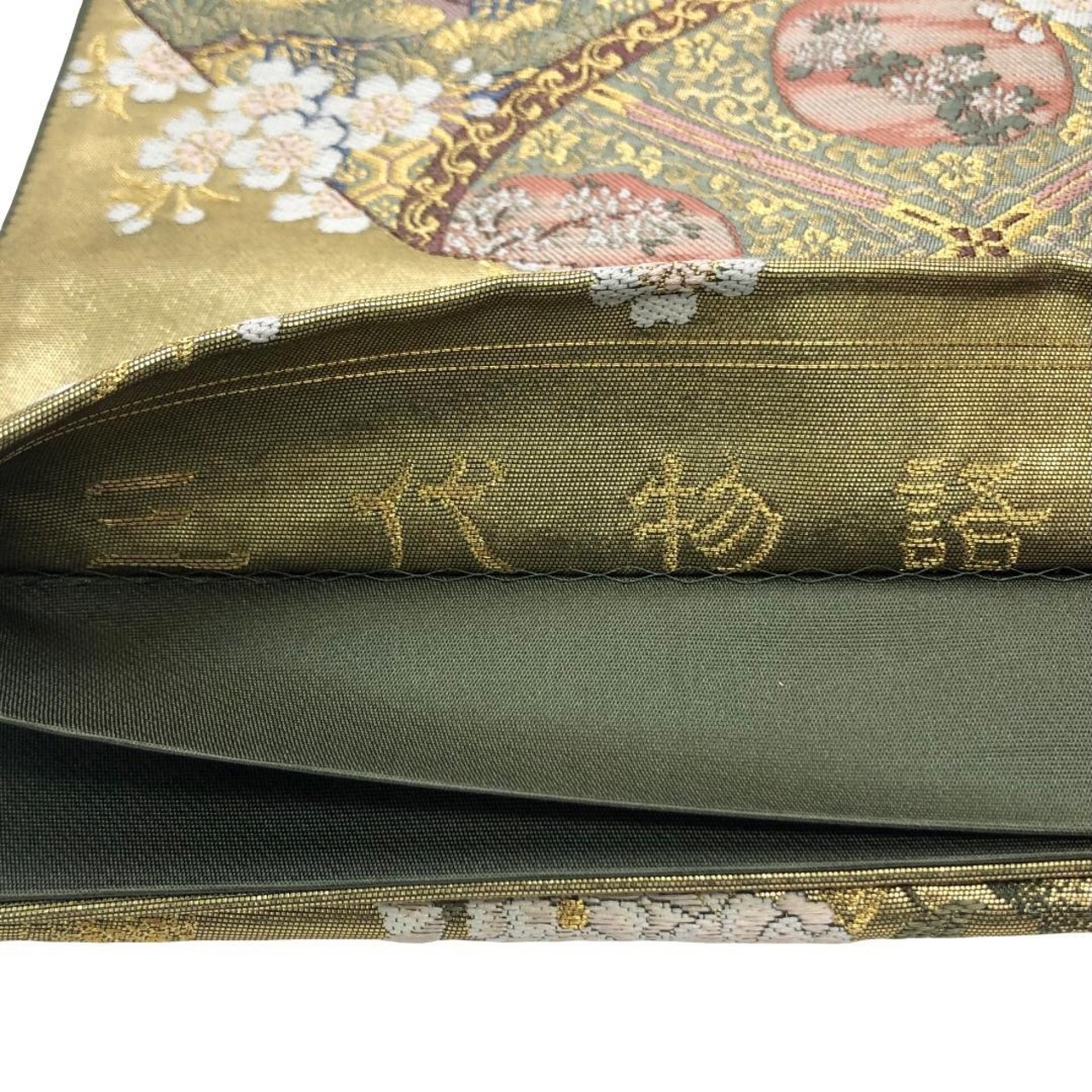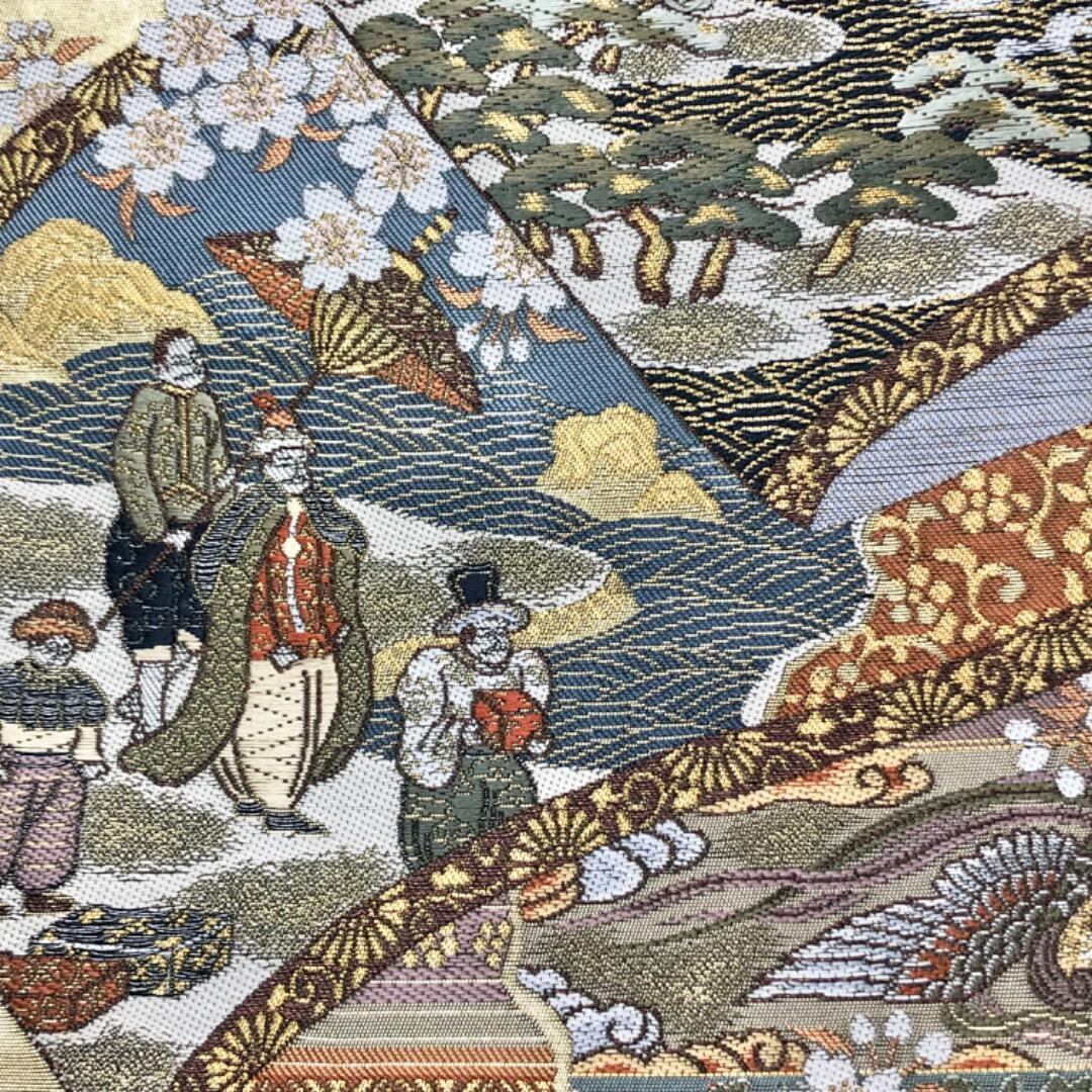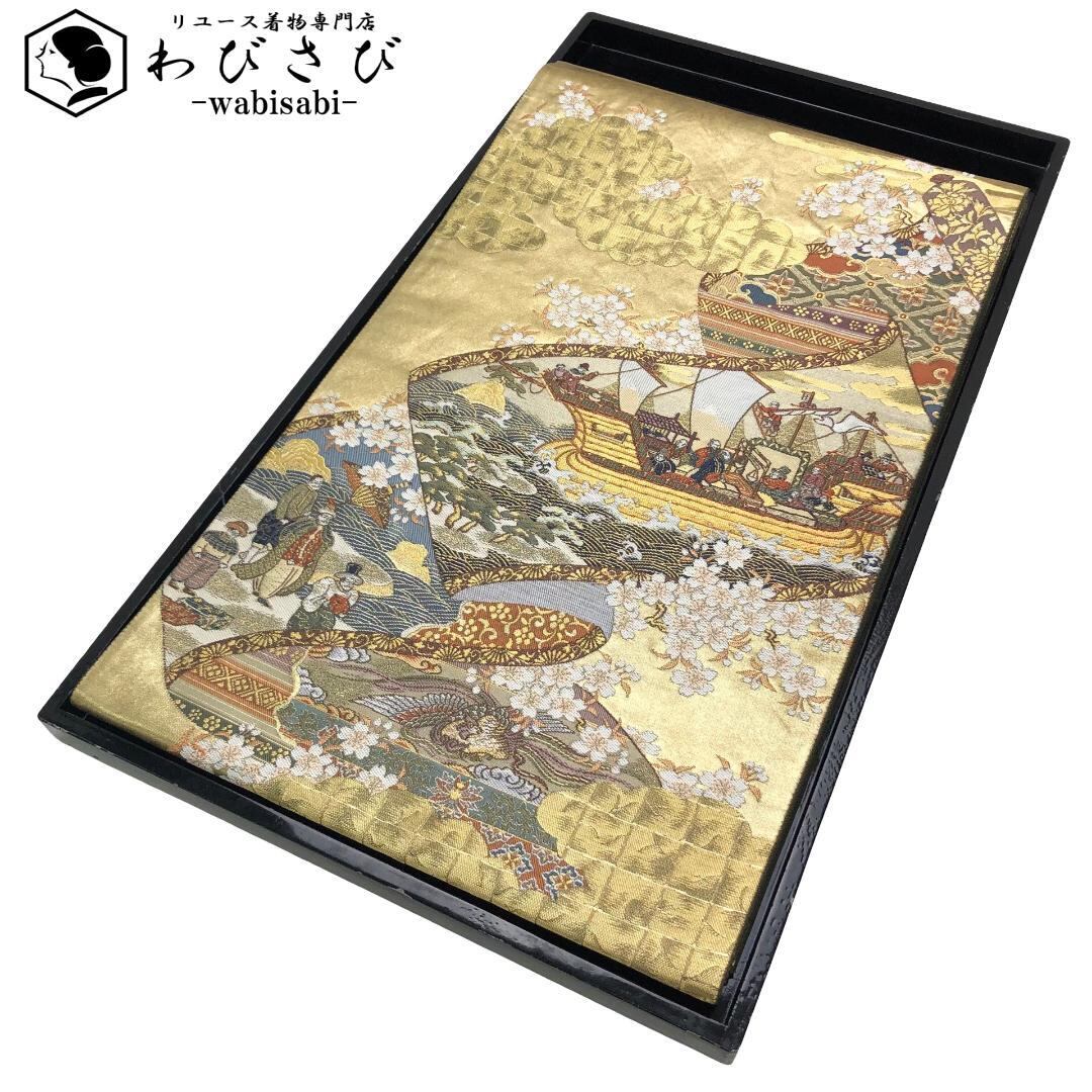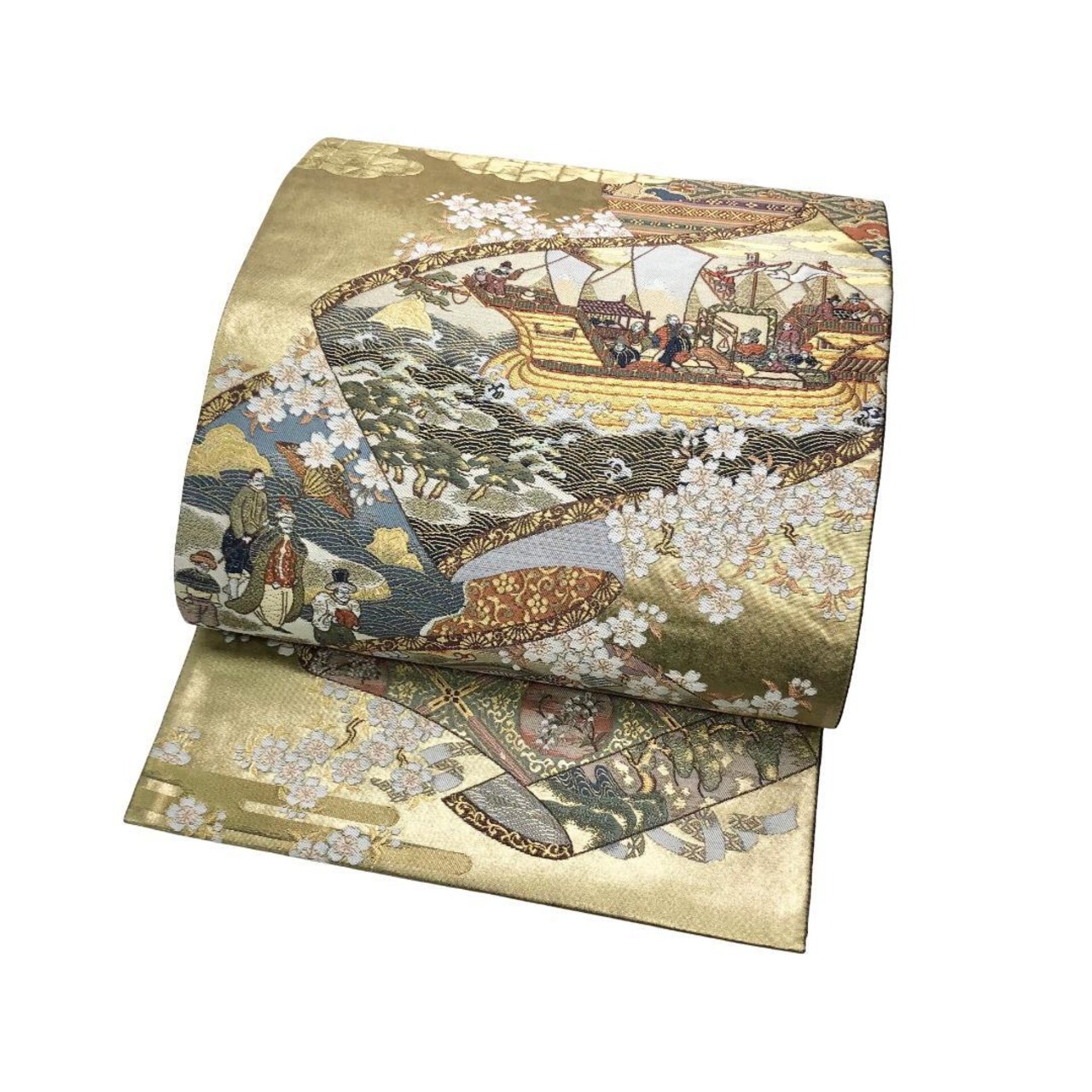 金色ベースのお色味に南蛮渡来、船、花模様などの柄行がデザインされた雰囲気の良い素敵なお品でございます。