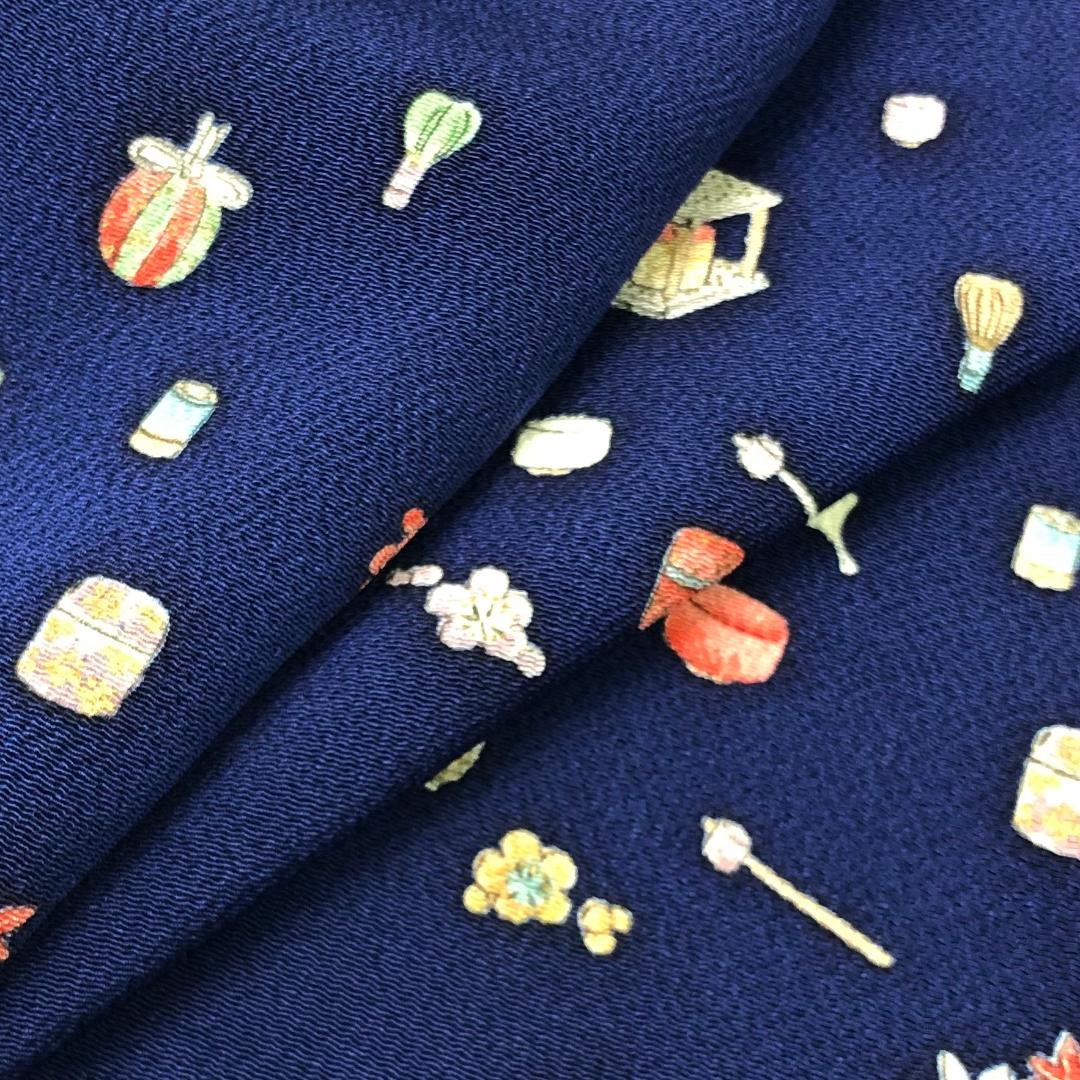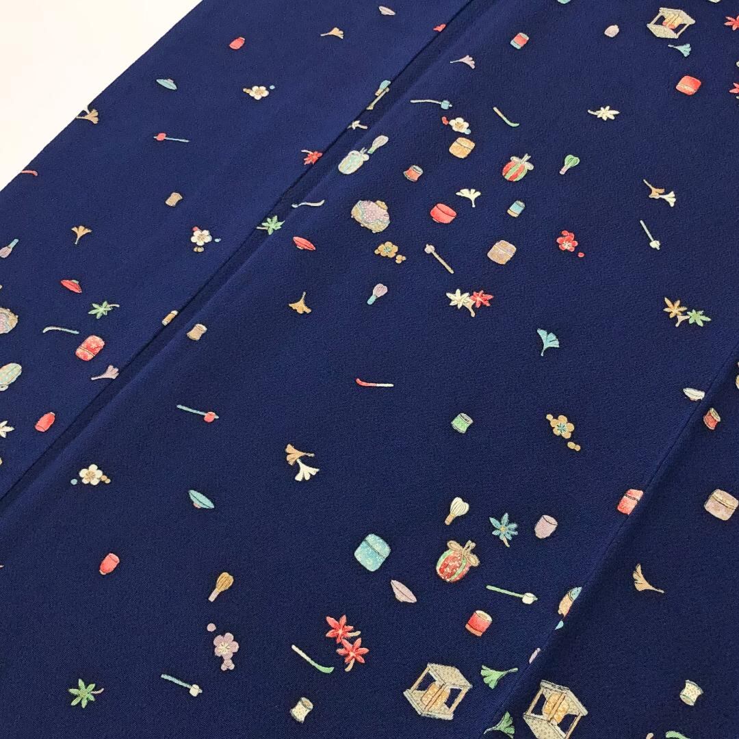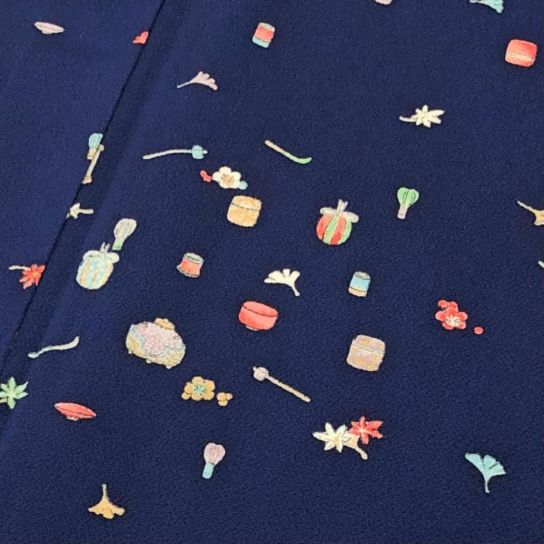 紺桔梗色のお色味に様々な可愛らしい茶道具の柄行がデザインされた素敵なお品でございます。