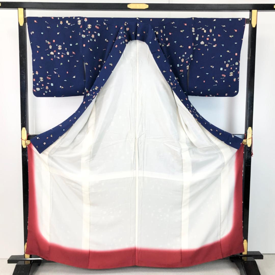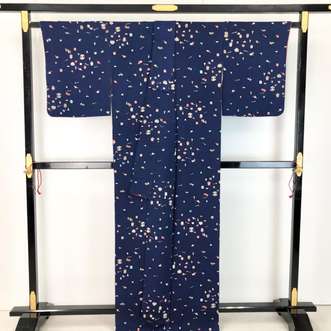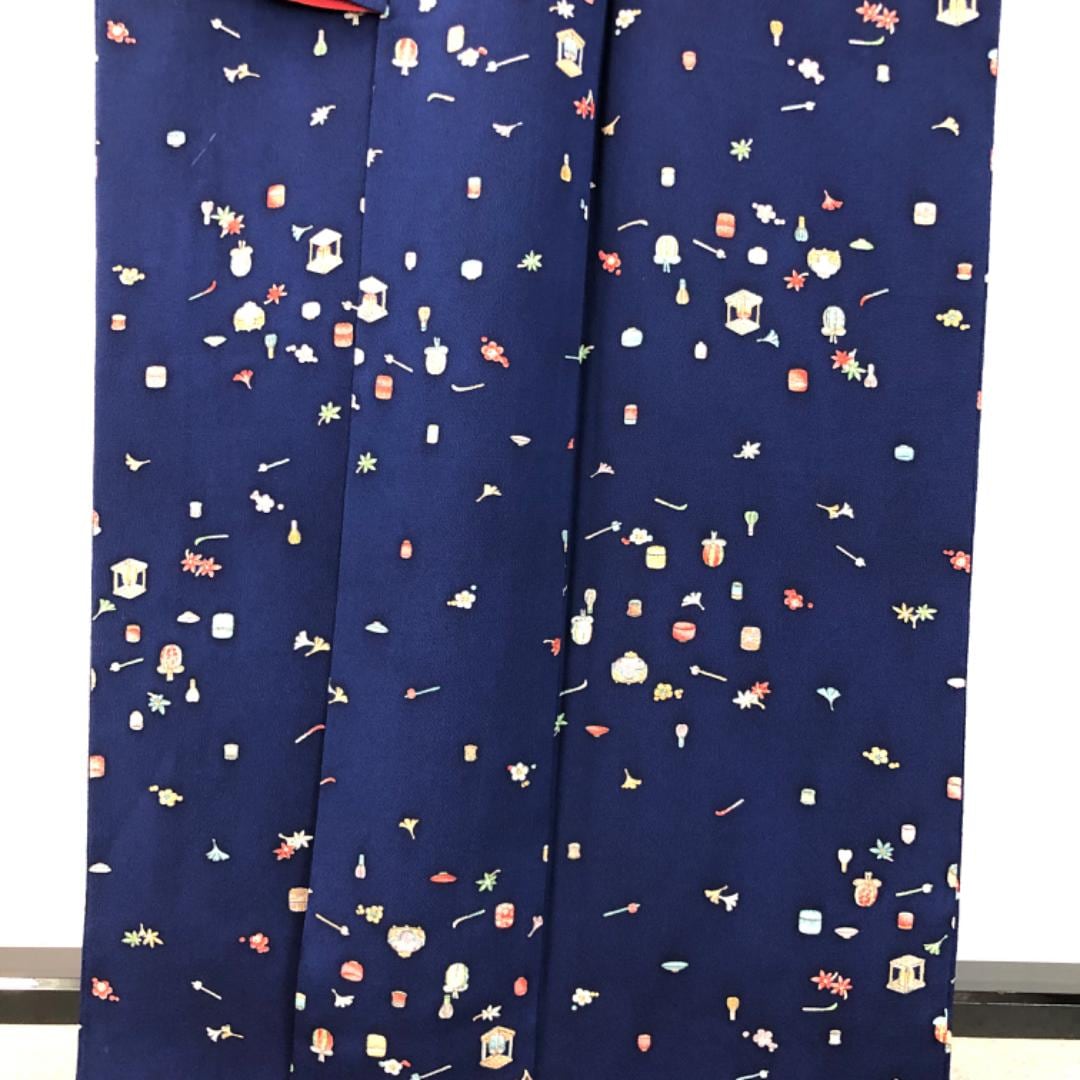 紺桔梗色のお色味に様々な可愛らしい茶道具の柄行がデザインされた素敵なお品でございます。