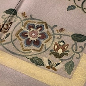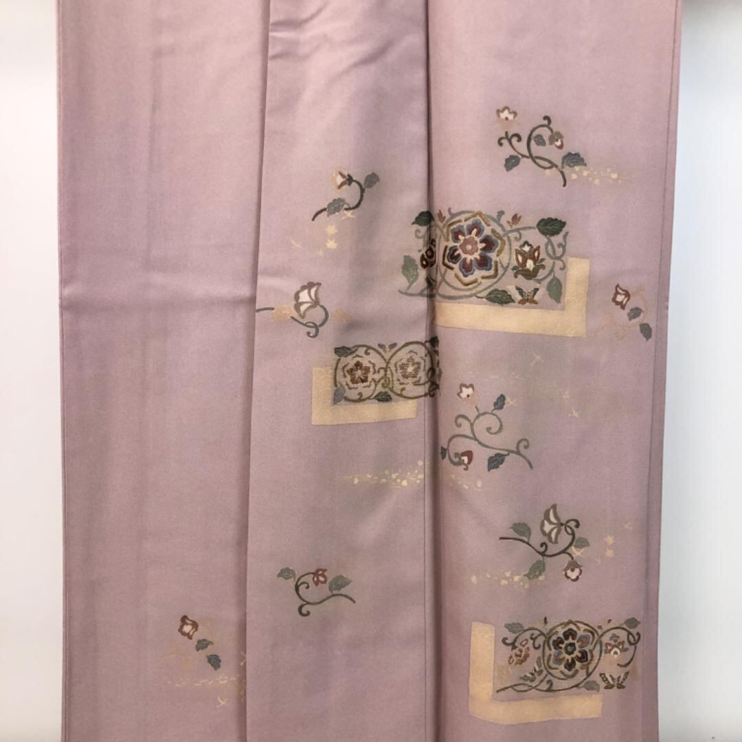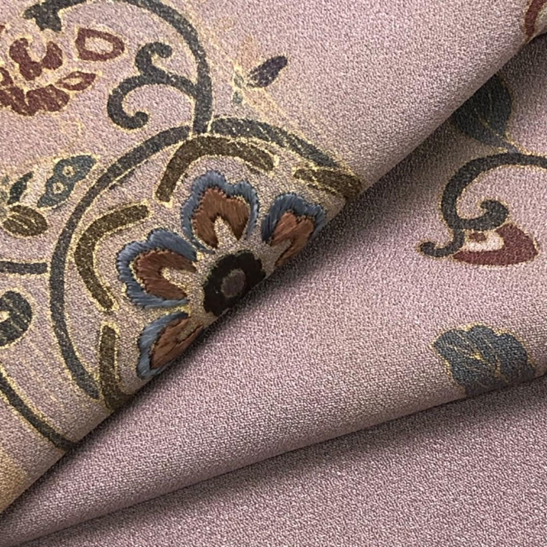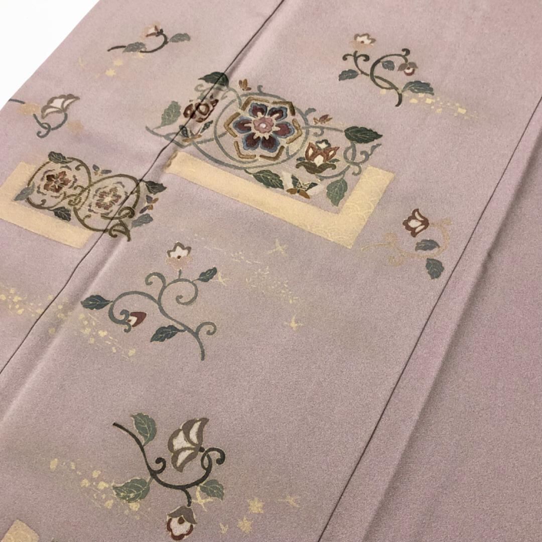 梅鼠色のお色味に花唐草模様がデザインされた素敵なお品でございます。