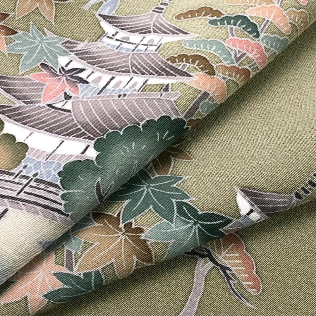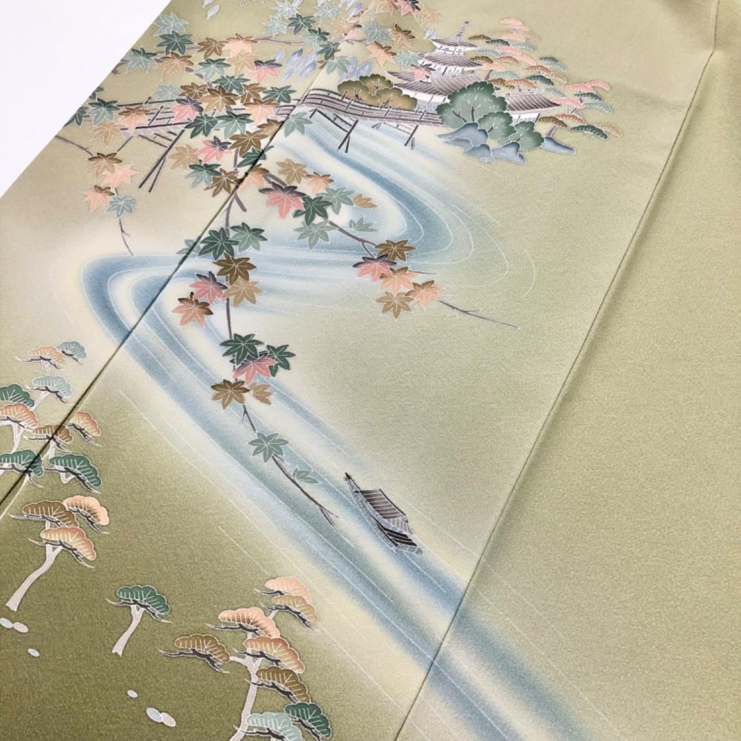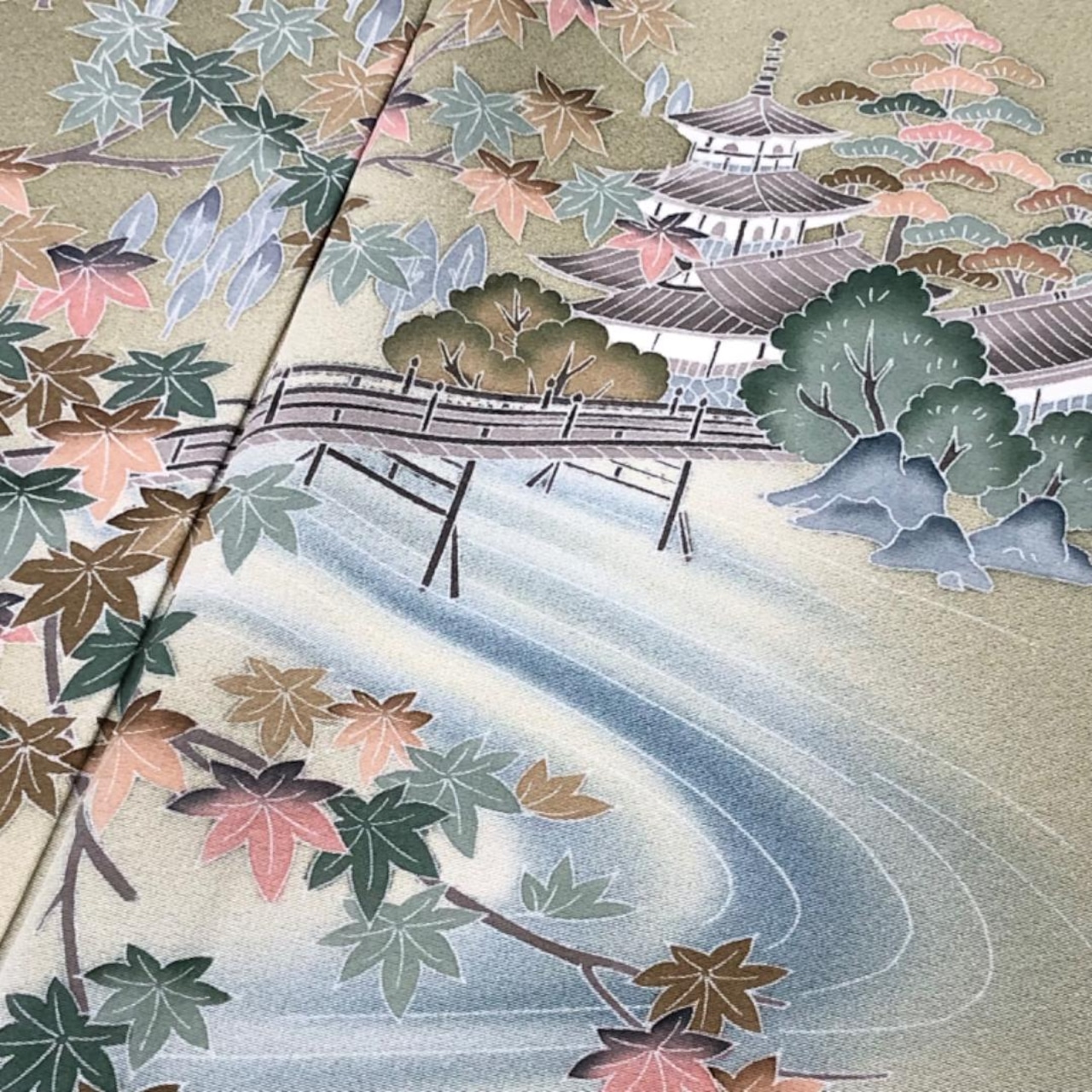 根岸色の品のあるお色味に流水に紅葉、松などの風景がデザインされた素敵なお品でございます。