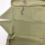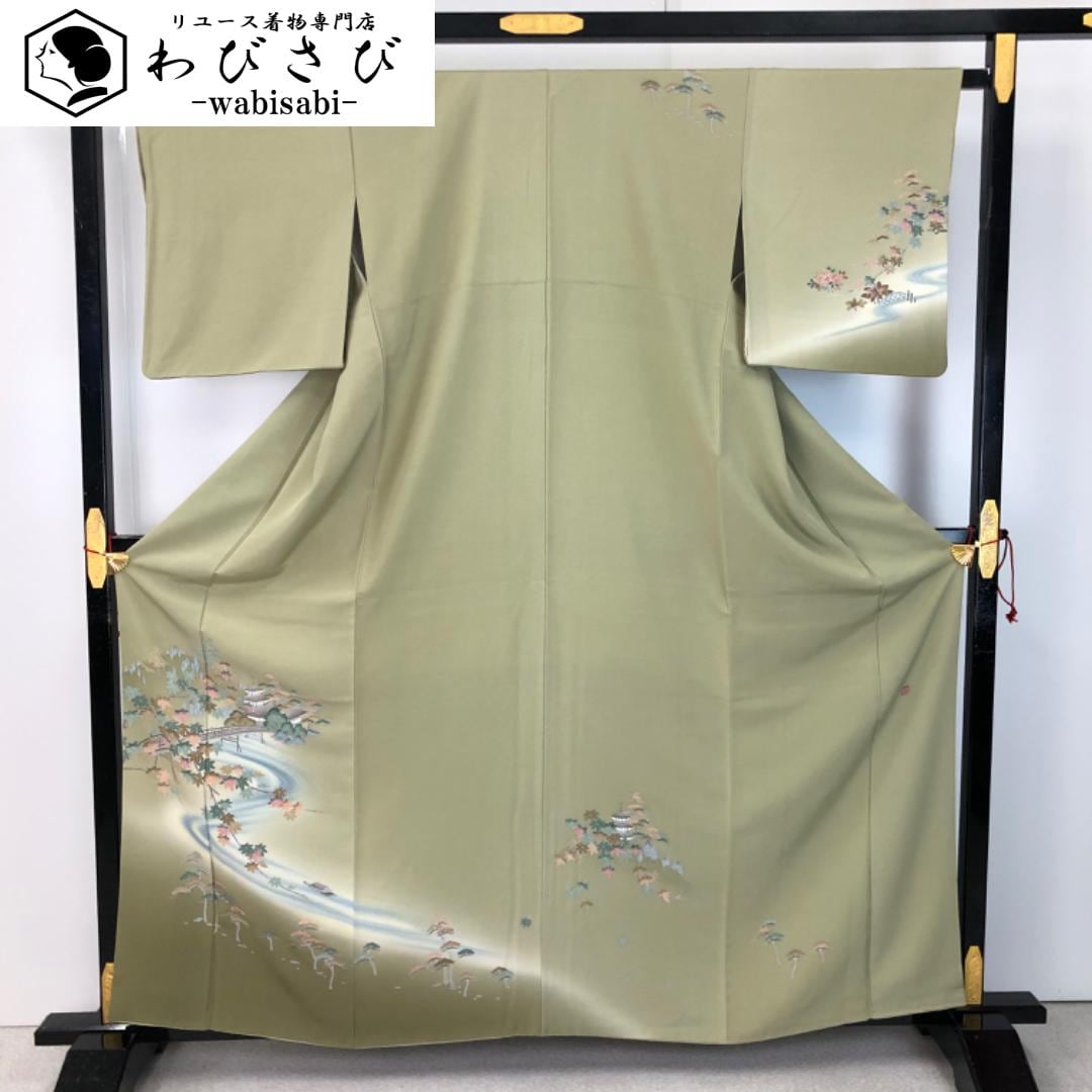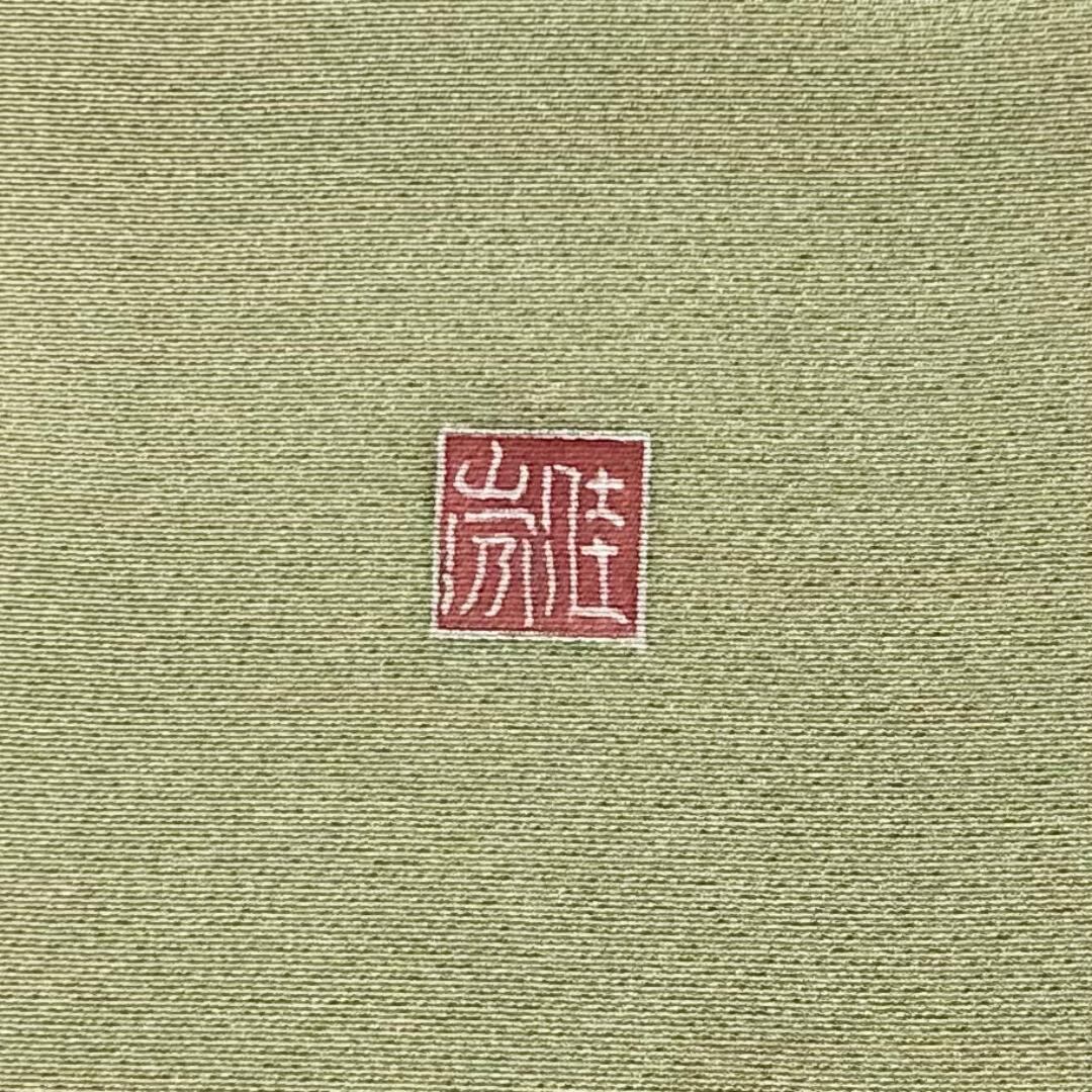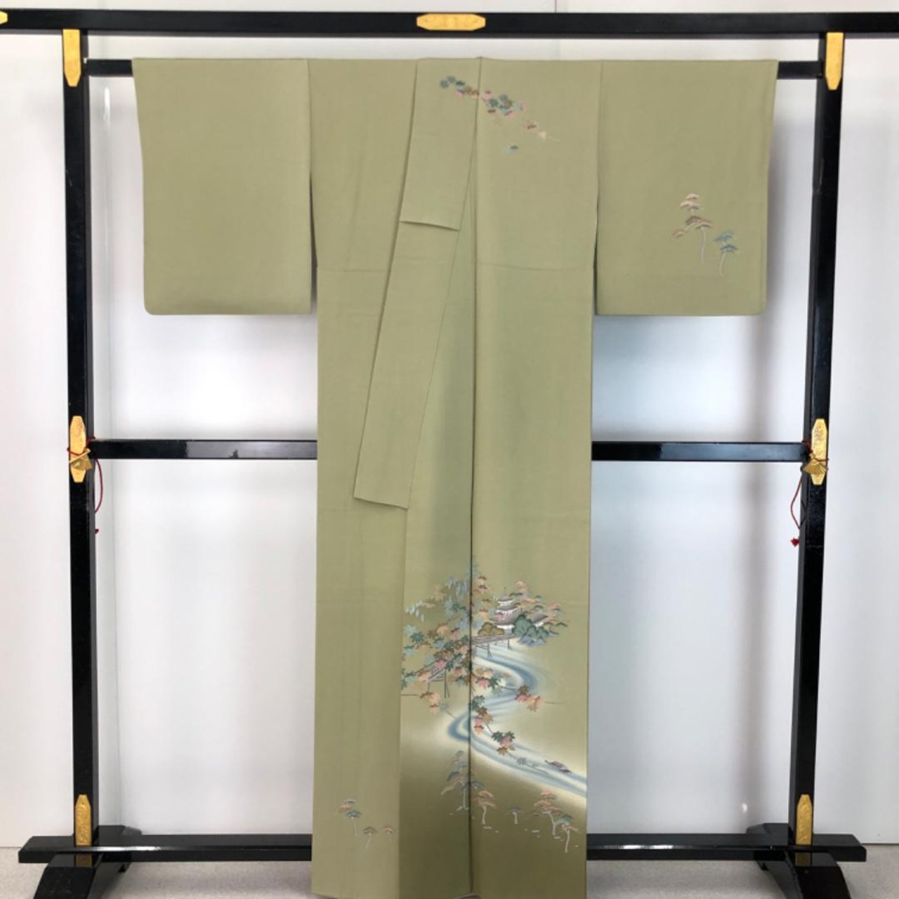 根岸色の品のあるお色味に流水に紅葉、松などの風景がデザインされた素敵なお品でございます。