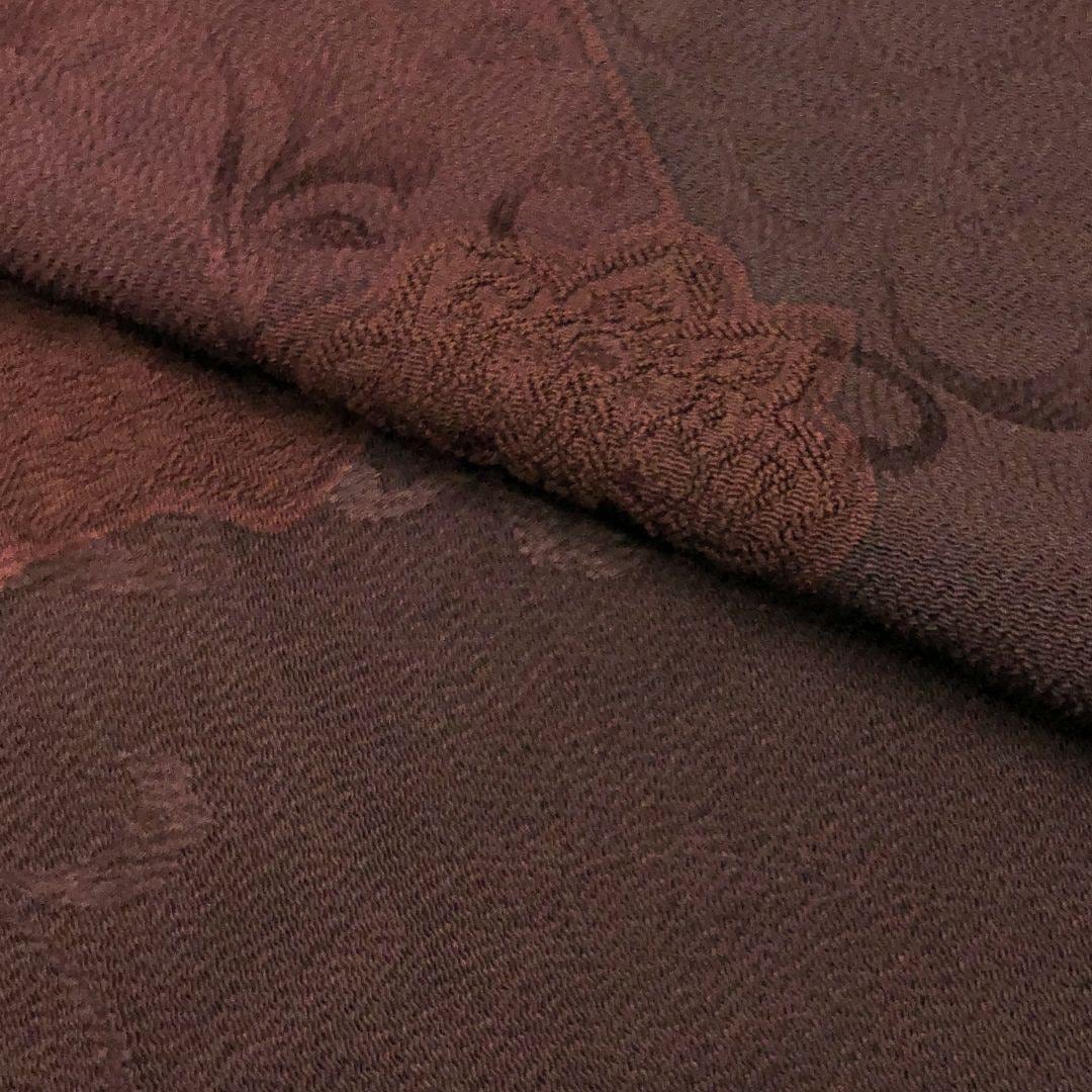 黒紅梅色ベースの落ち着きのあるお色味に暈し、上品な花唐草模様の柄裄がデザインされた素敵なお品でございます。