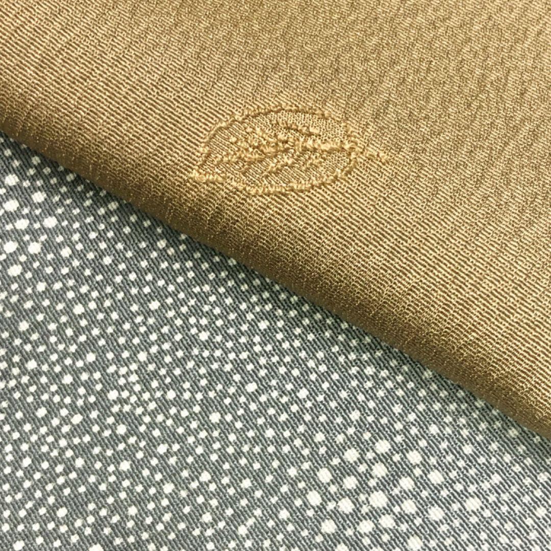 伽羅色のお色味に暈しの丸模様に葉模様の柄裄がデザインされた素敵なお品でございます。