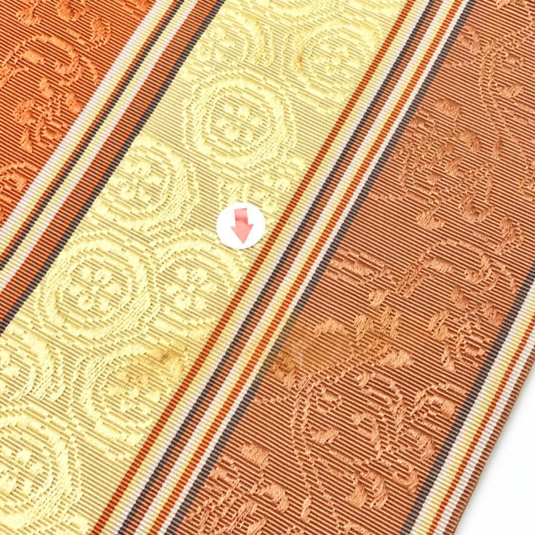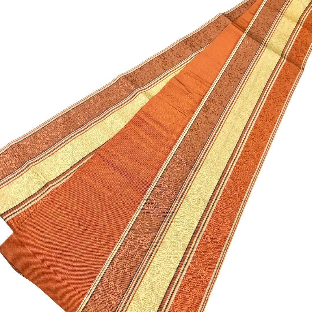 半幅帯 本場筑前博多織 縦縞模様に花唐草模様 証紙付 茶橙色 D-2084 着物 きもの kimono 和服 和装 中古 リサイクル着物 【送料無料】
