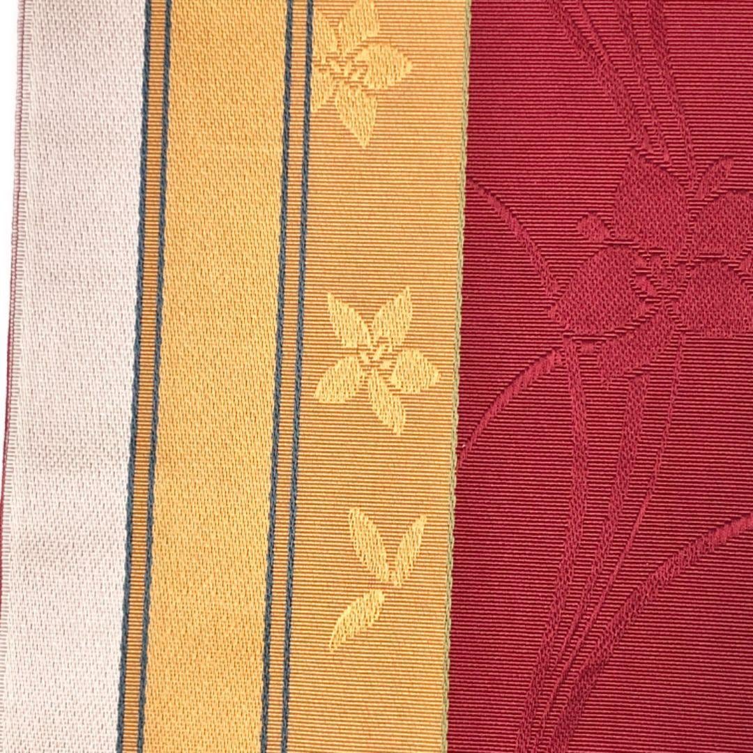 半幅帯 本場筑前博多織 縦縞模様に花模様 真紅色 D-2085 着物 きもの kimono 和服 和装 中古 リサイクル着物 【送料無料】