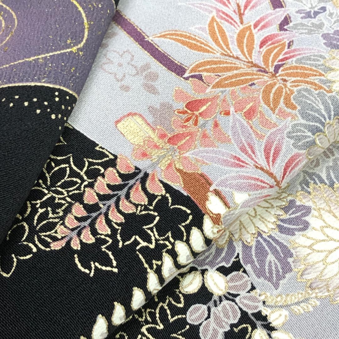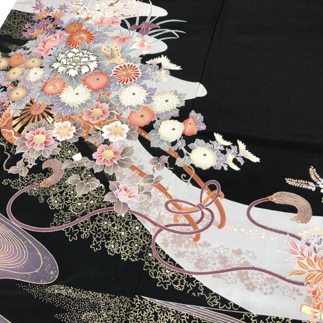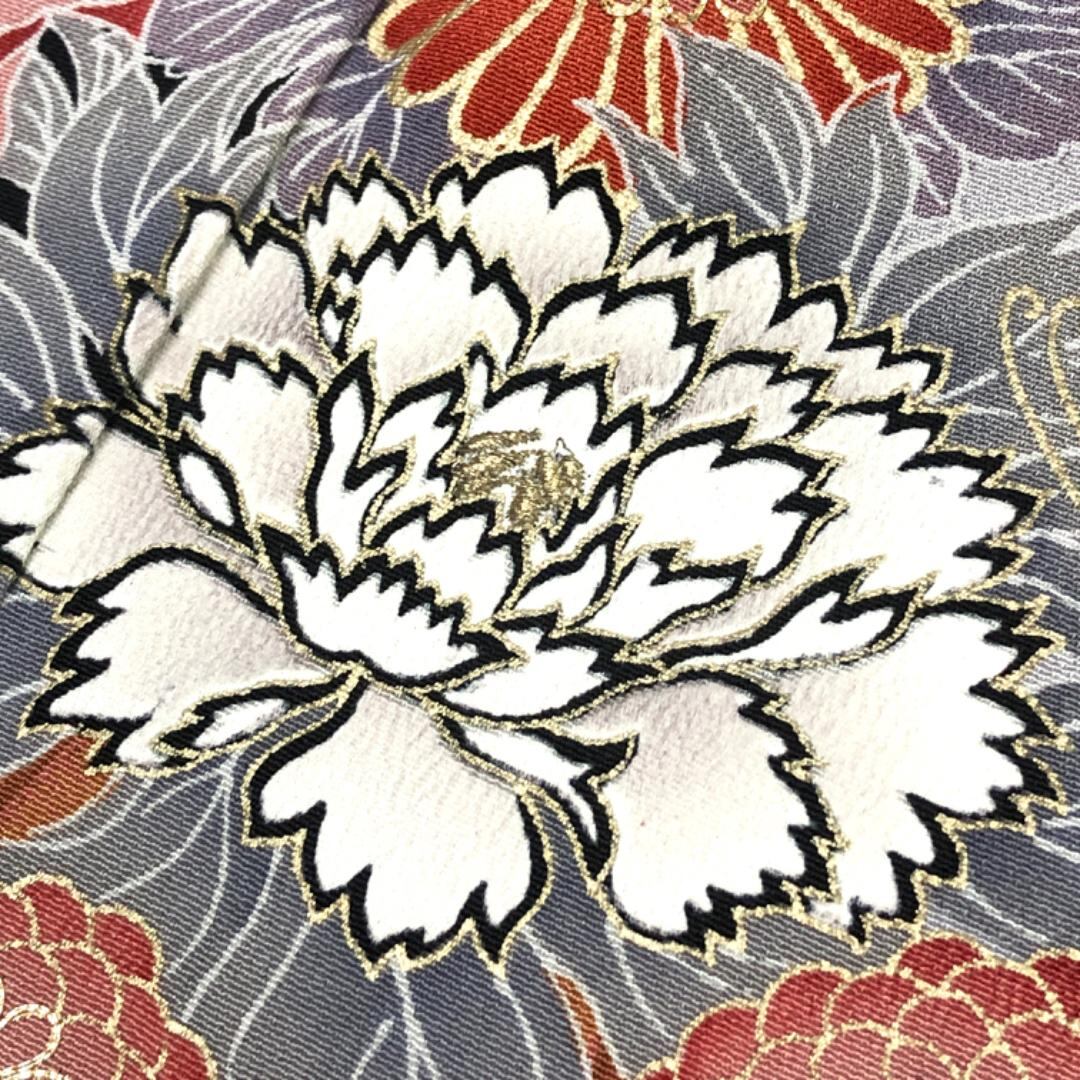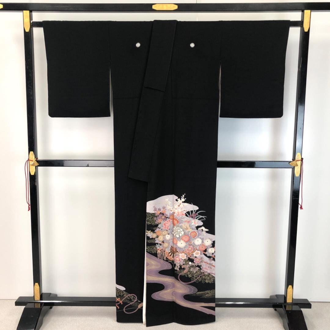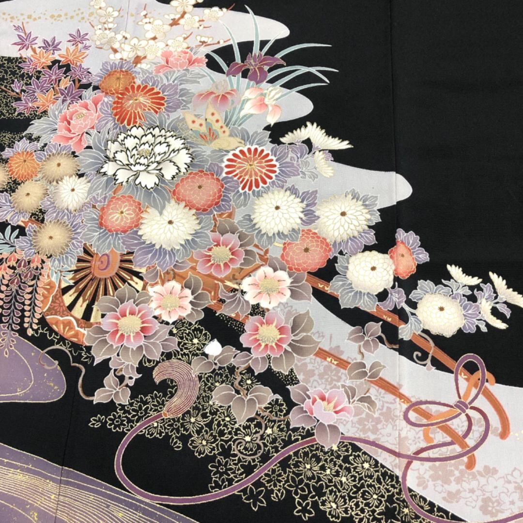 流水、霞模様に華やかで美しい花車がデザインされた素敵な柄裄のお品でございます。