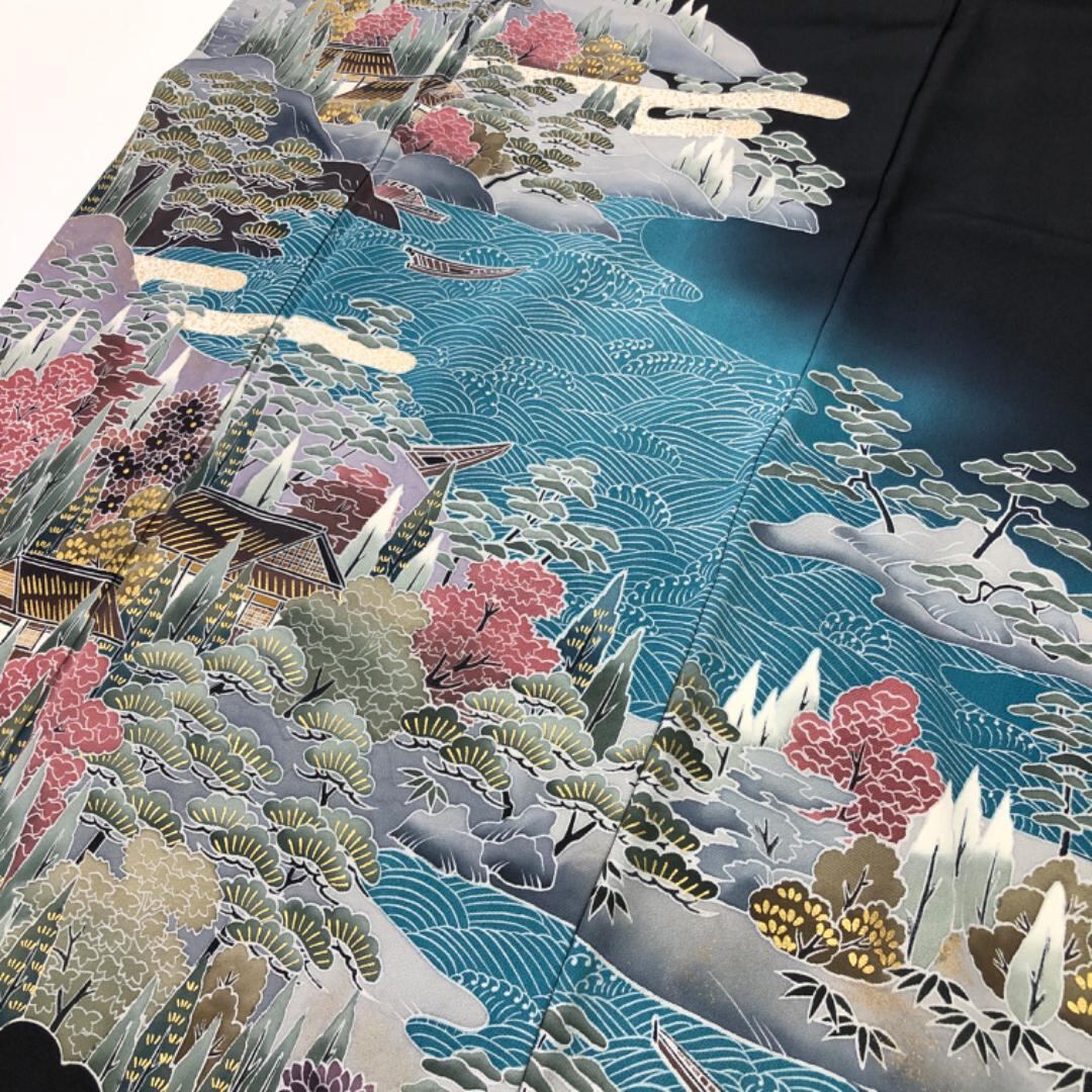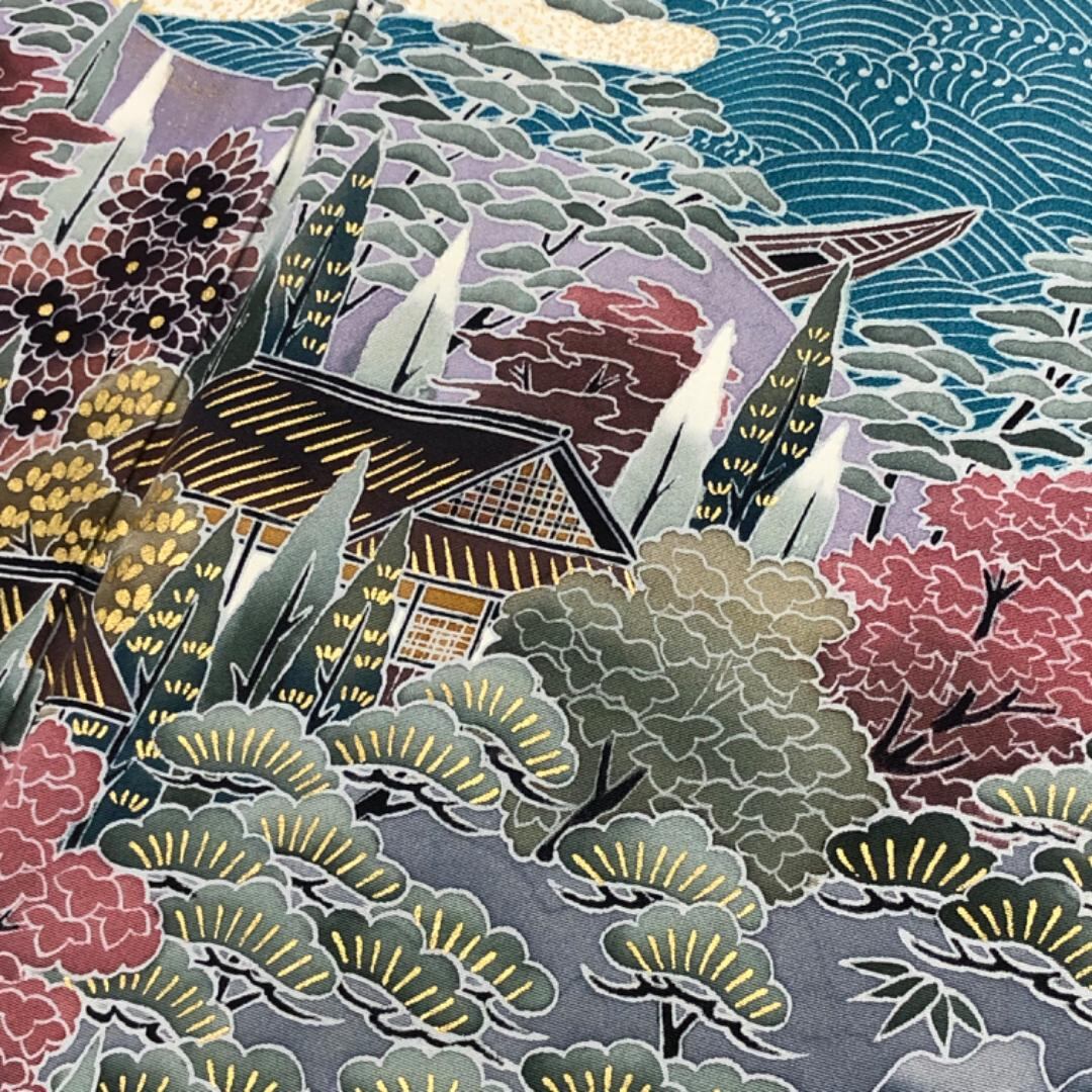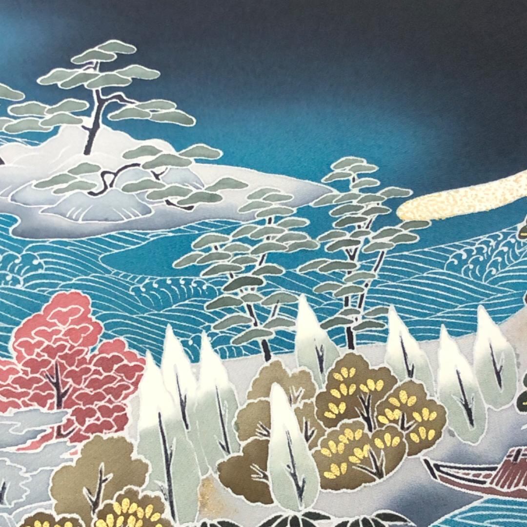 波に松などの風景模様の柄裄がデザインされた雰囲気の良い素敵なお品でございます。