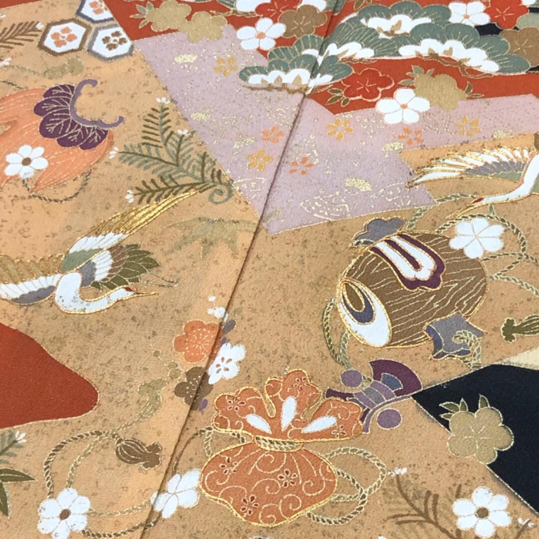 金彩が使われた花七宝、宝尽くし、鶴に花模様などの煌びやかな柄裄がデザインされた素敵なお品でございます。