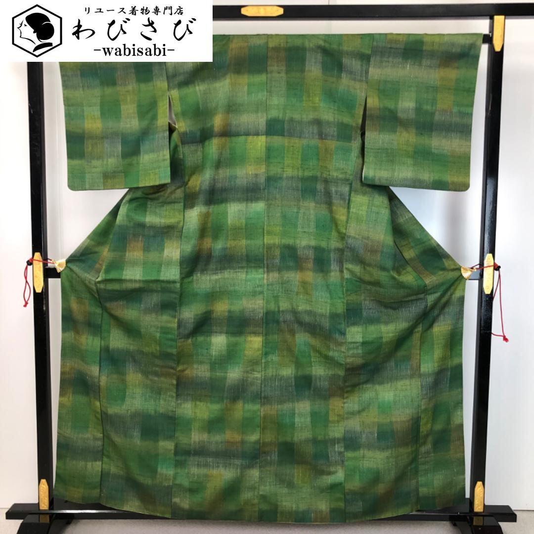 紬着物 暈し格子模様 緑茶色 K-5526 着物 きもの kimono 和服 和装 中古 リサイクル着物 【送料無料】