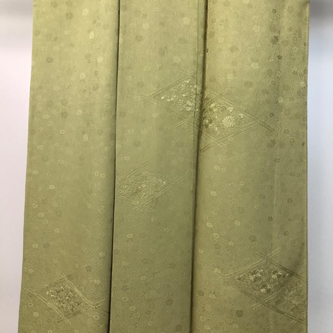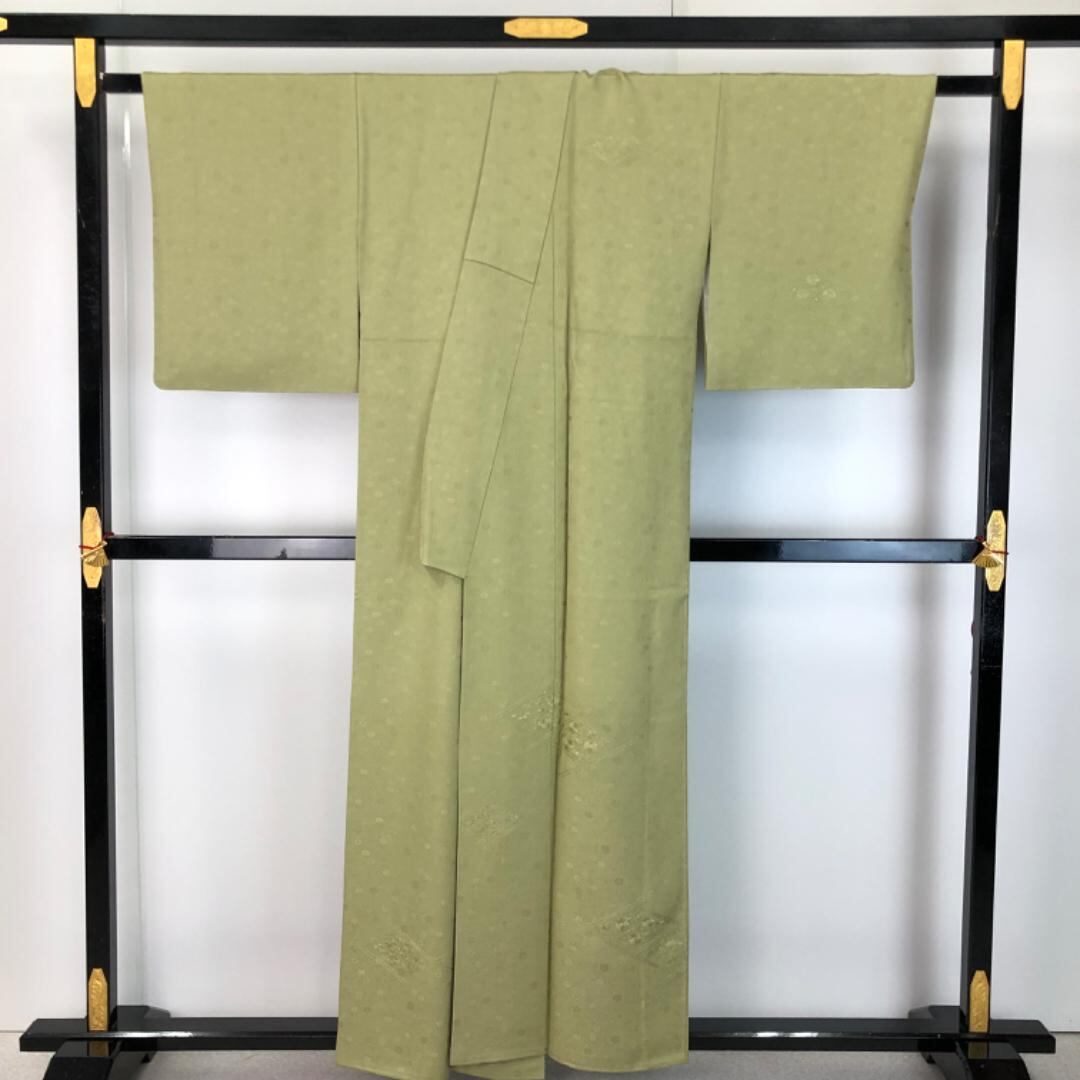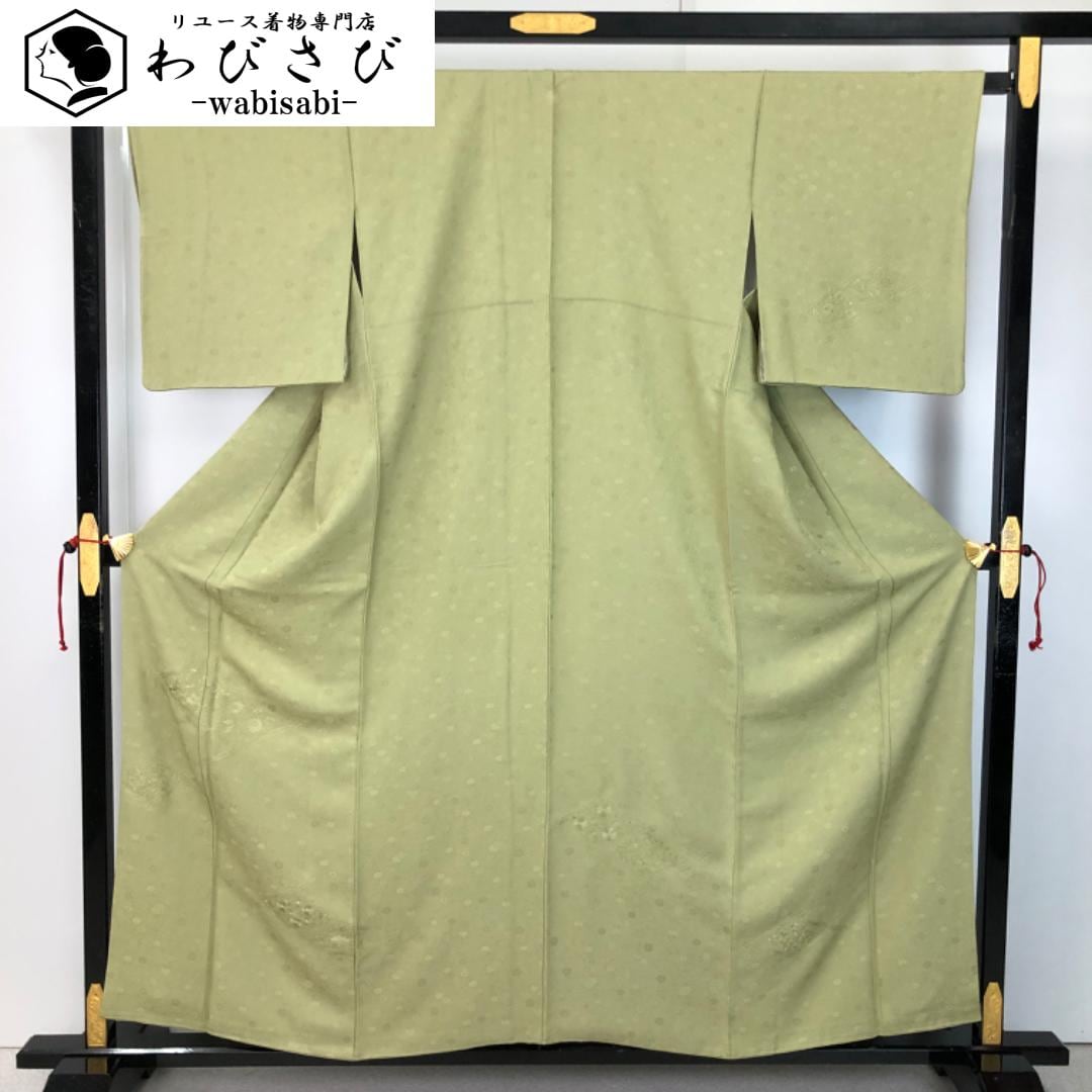 色無地 柳茶色 刺繍 菱形に花模様 縮緬 ますいわ屋 ガード加工 K-5555 着物 きもの kimono 和服 和装 中古 リサイクル着物 【送料無料】