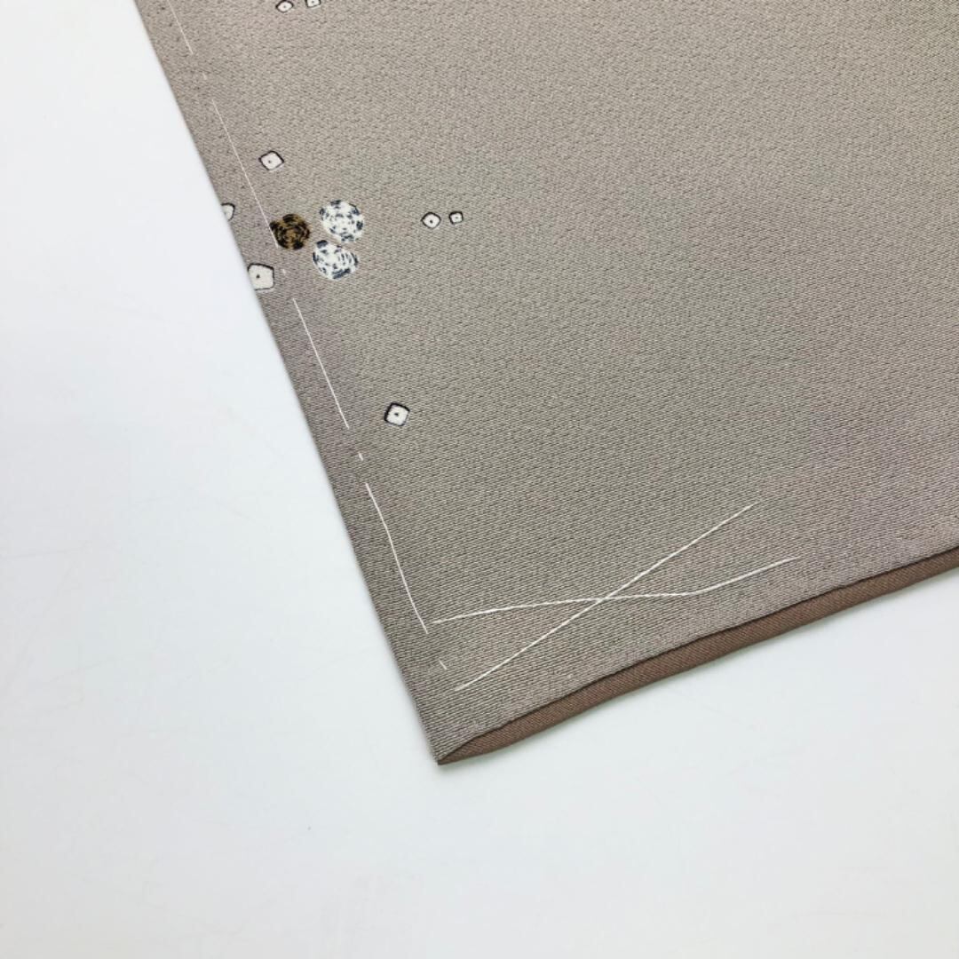 遠州鼠色の品のあるお色味に抽象花模様の柄裄がデザインされた雰囲気の良い素敵なお品でございます。