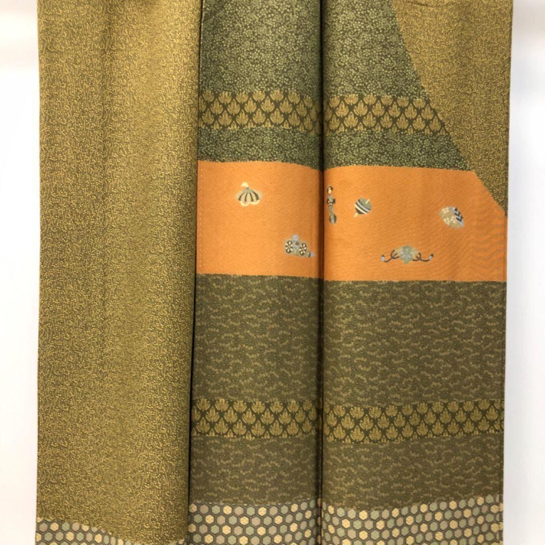 樹皮色ベースのお色味の縮緬地にこけし、駒などの柄裄がデザインされた素敵なお品でございます。