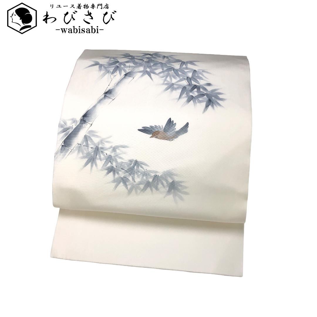 名古屋帯 作家物 塩瀬 手描き 鳥 竹 笹の葉 乳白色 O-5502 着物 きもの kimono 和服 和装 中古 リサイクル着物 【送料無料】