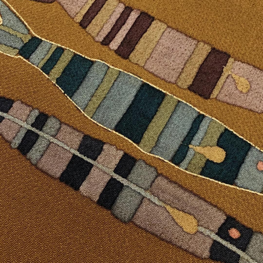 蜜柑茶色の落ちついたお色味の縮緬に抽象柄の魚、縦縞模様がデザインされた雰囲気の良い素敵なお品でございます。