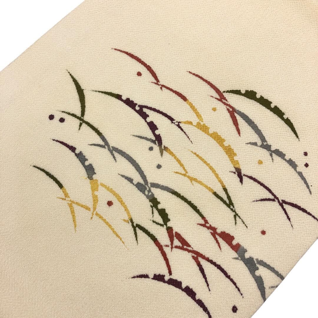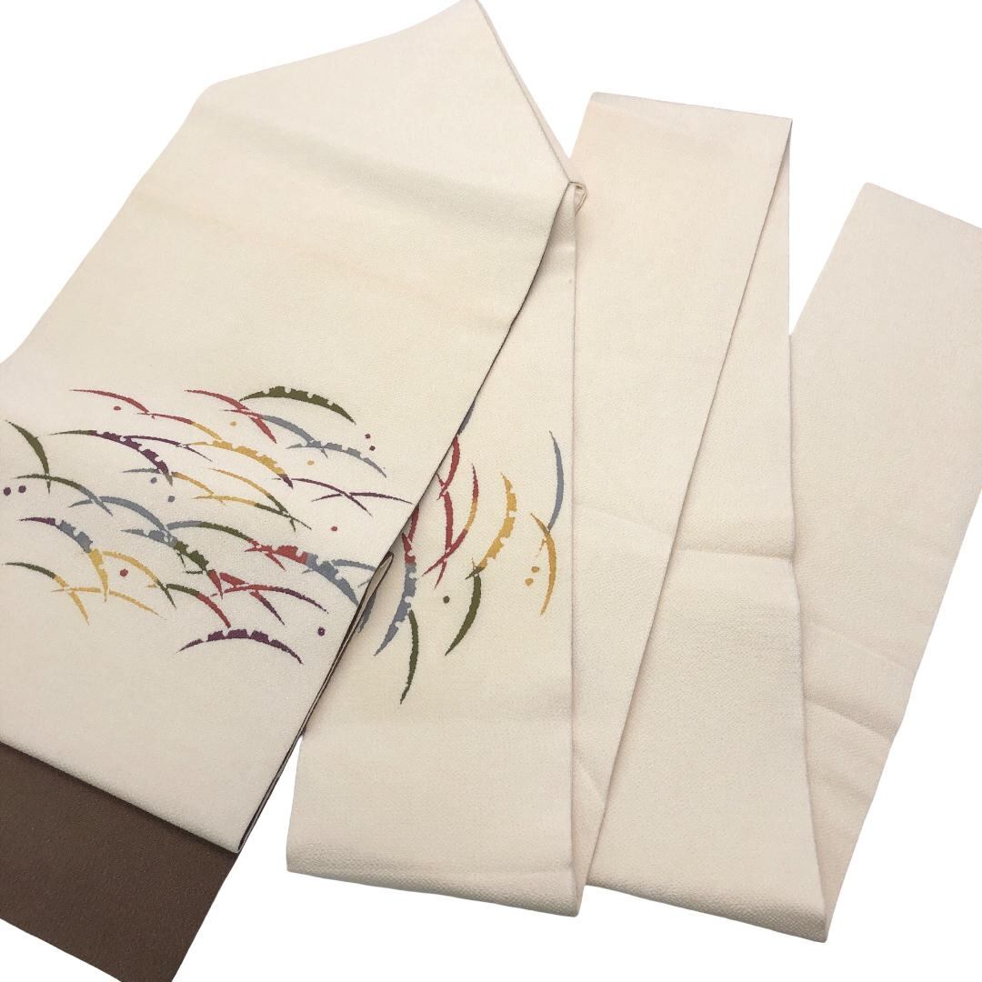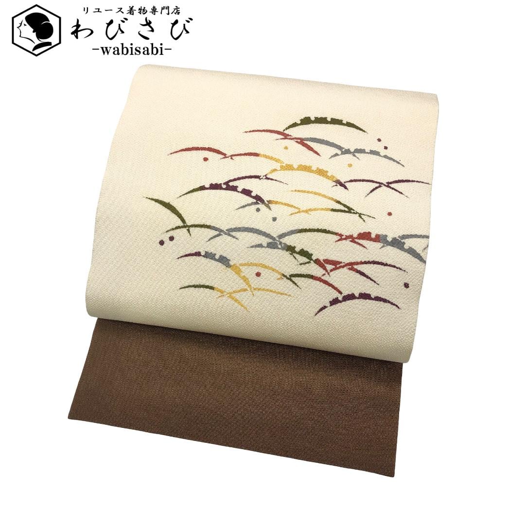 名古屋帯 型染 露芝 雪芝模様 縮緬 生成色 O-5508 着物 きもの kimono 和服 和装 中古 リサイクル着物 【送料無料】
