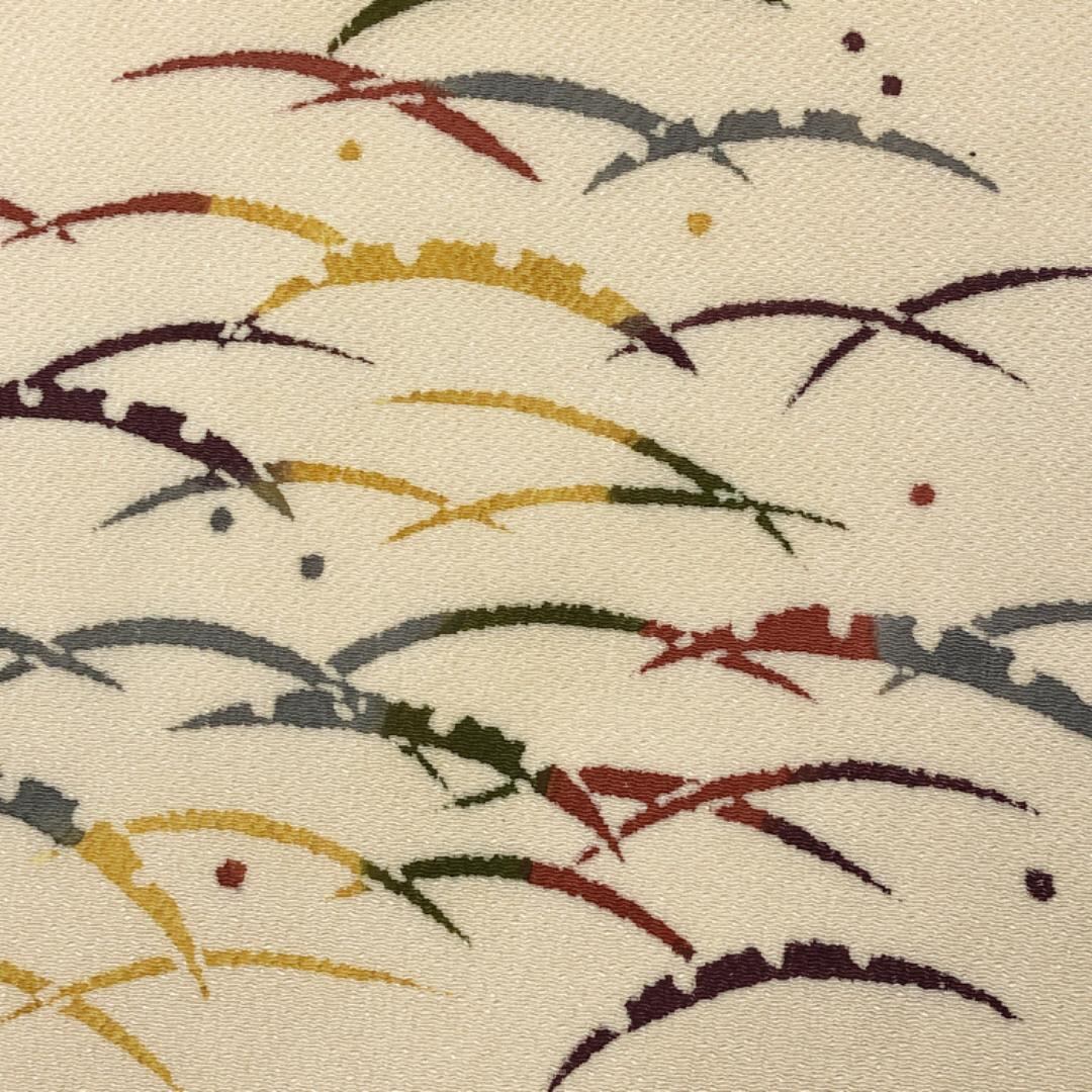 生成色の品のあるお色味の縮緬地に型染の露芝、雪芝模様がデザインされた雰囲気の良い素敵な柄裄のお品でございます。