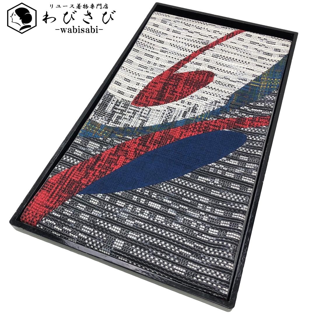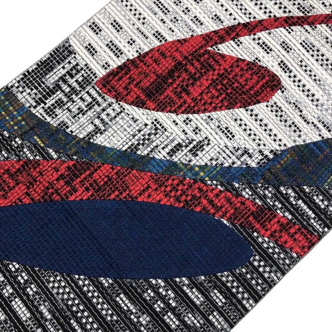 モノトーンベースの白黒のお色に赤青の音符のような抽象模様の柄裄がデザインされた雰囲気の良い素敵なお品でございます。
