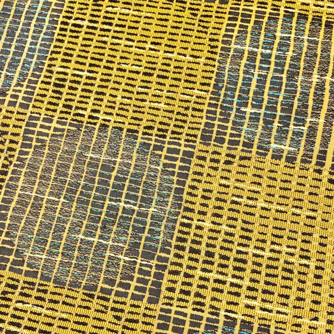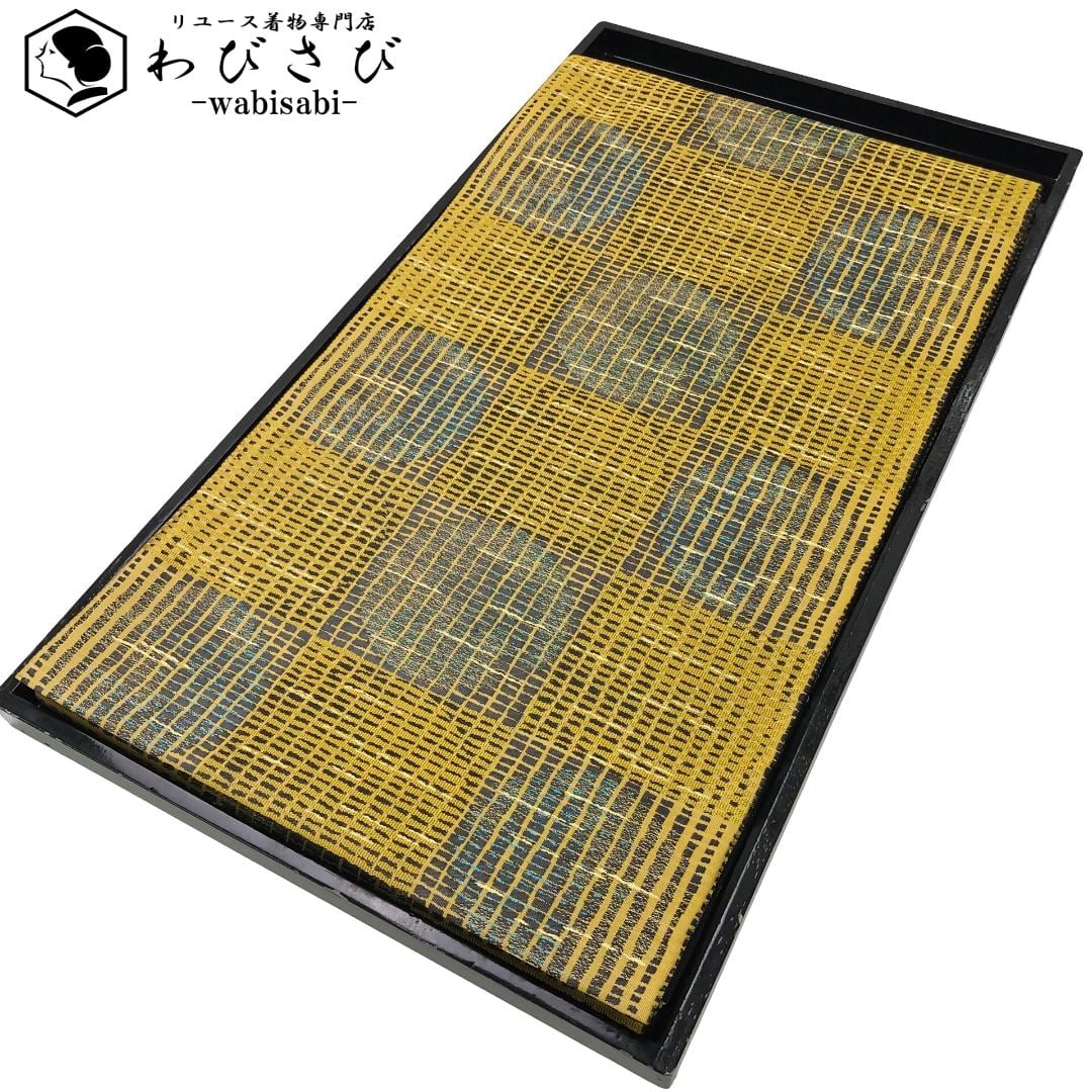 黄土色ベースのお色味に四角に丸の柄裄がデザインされた素敵なお品でございます。