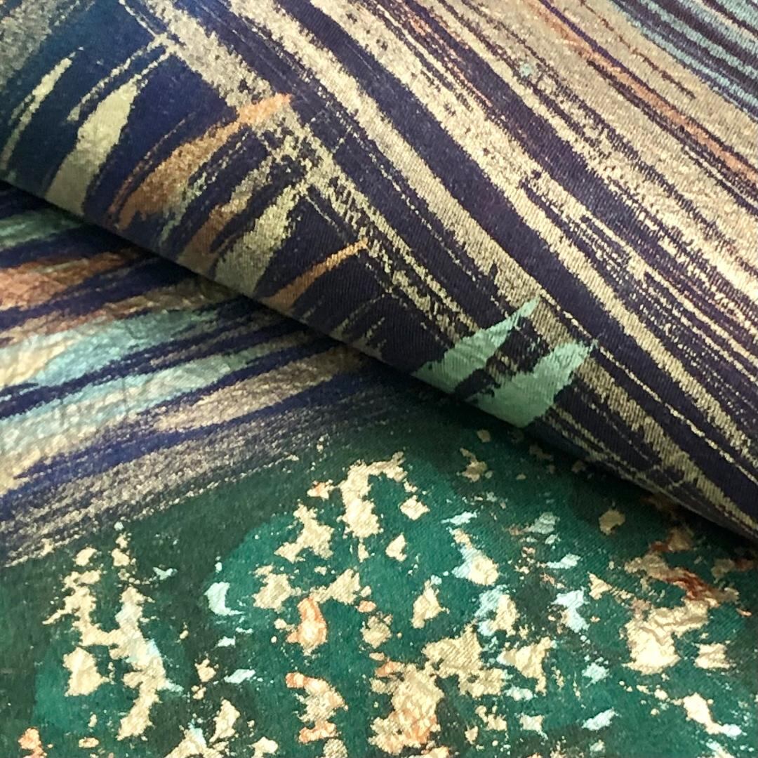 金彩が使われた多様な色彩の抽象模様がデザインされた印象的な素敵な柄裄のお品でございます。