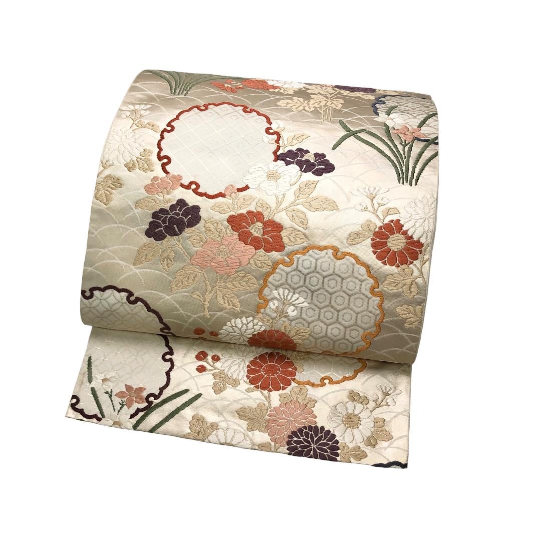 袋帯 唐織 雪輪 花模様 金糸 生成色 O-5740 着物 きもの kimono 和服 和装 中古 リサイクル着物 【送料無料】