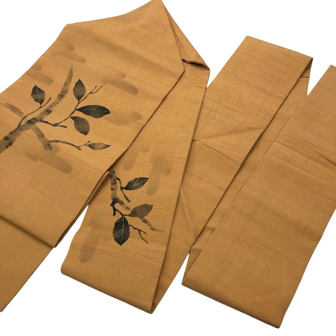 名古屋帯 紬 作家物 手描き 枝葉模様 狐色 O-5744 着物 きもの kimono 和服 和装 中古 リサイクル着物 【送料無料】