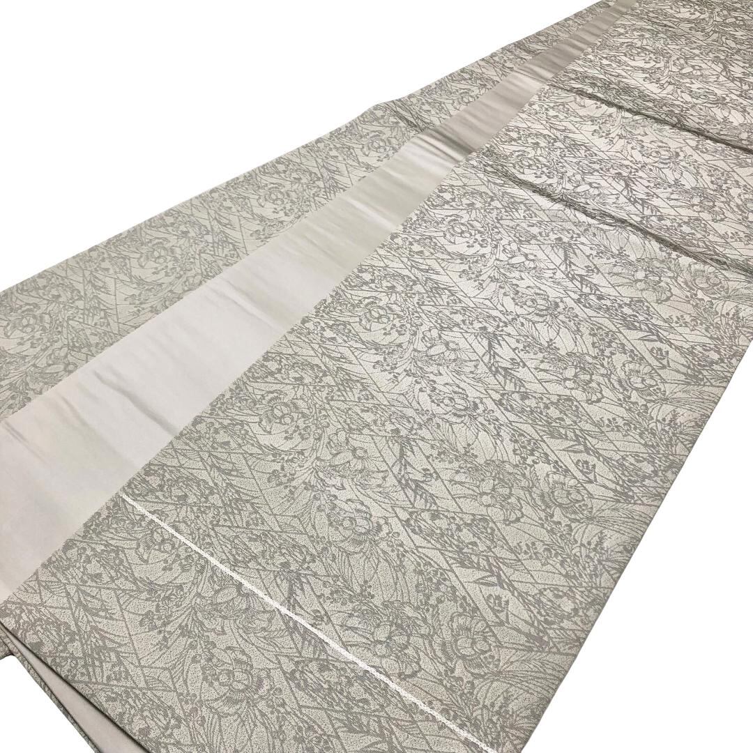 絹鼠色の品のあるお色味に抽象的なふくら雀、草花模様がデザインされた雰囲気の良い素敵な柄裄のお品でございます。