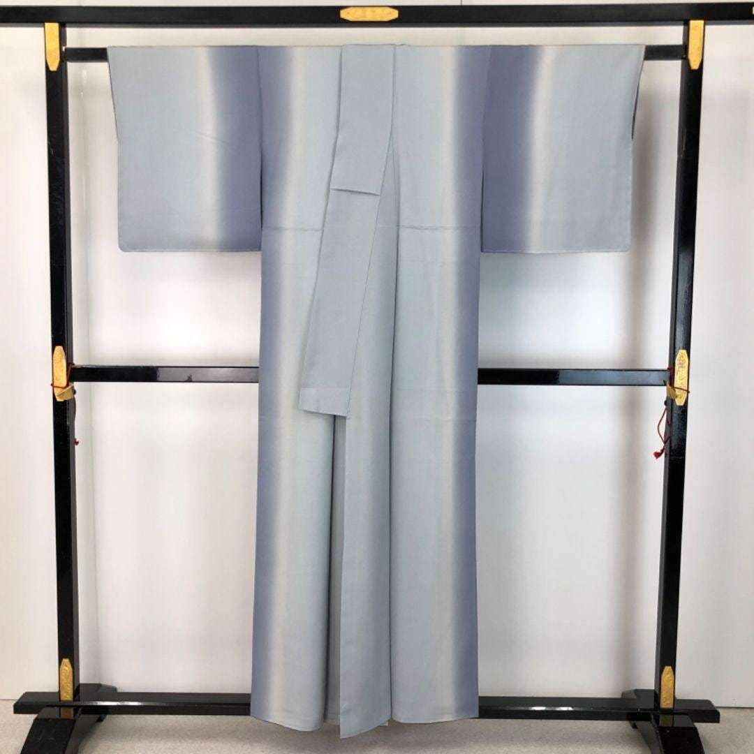 小紋 縦縞 美しいグラデーション 空鼠色 縮緬 しつけ糸 K-5658 着物 きもの kimono 和服 和装 中古 リサイクル着物 【送料無料】