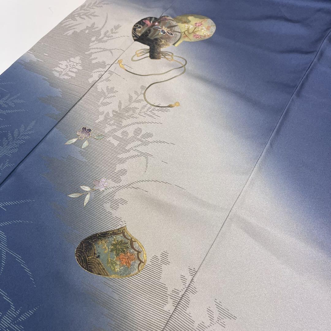 錫紵色に暈し、螺鈿が使われた品のある草花模様がデザインされた素敵な柄裄のお品でございます。